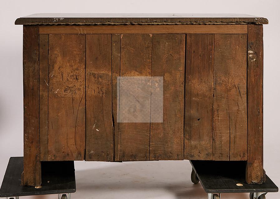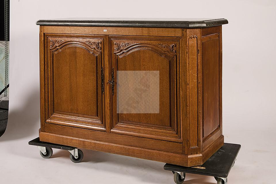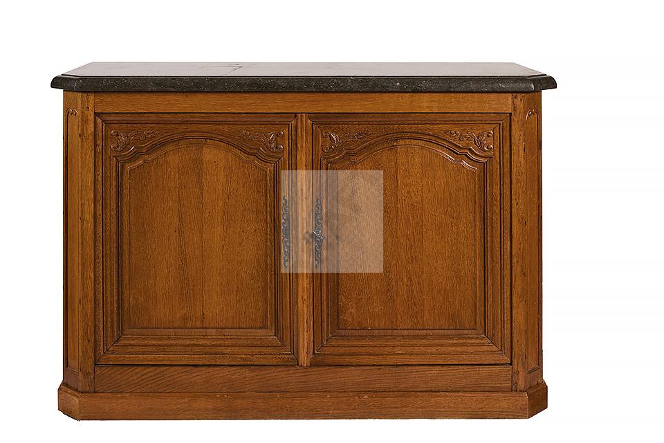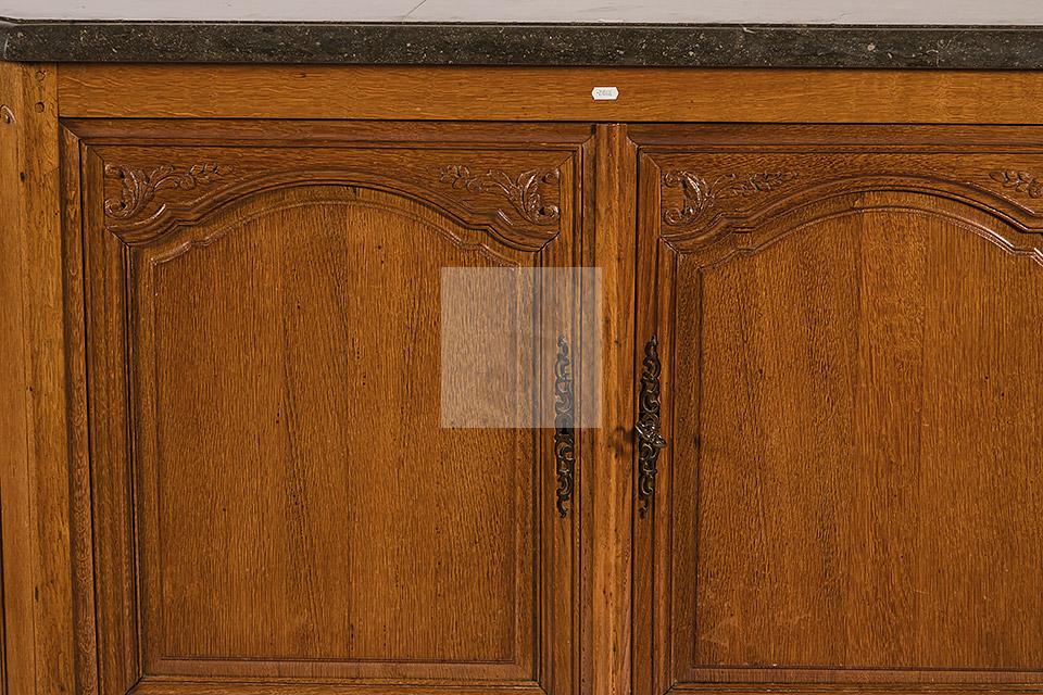 474 Buffet à hauteur d’appui en chêne mouluré à décor de fleurettes, ouvre à deux vantaux, pose sur une plinthe, plateau de marbre veiné.