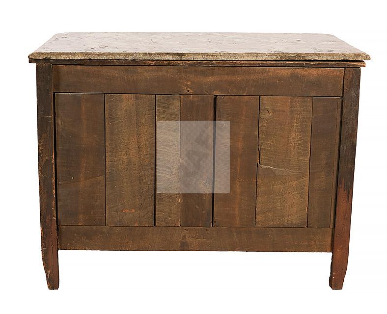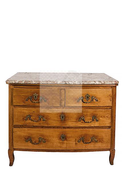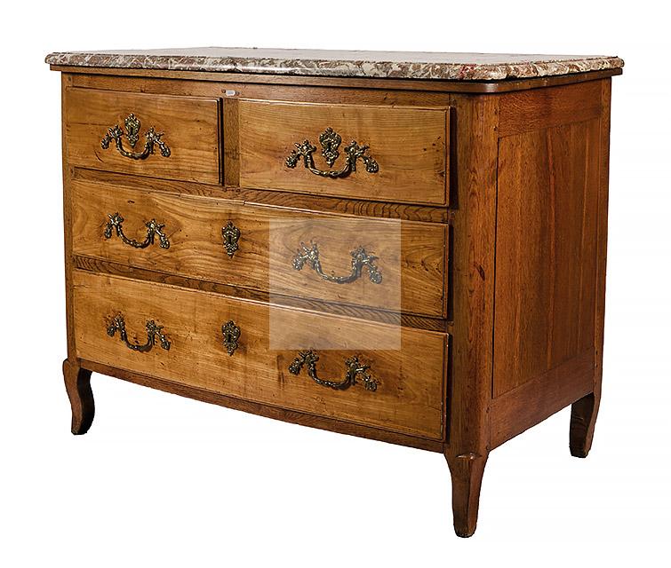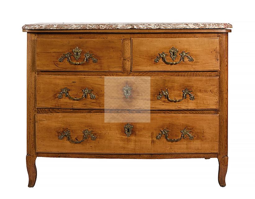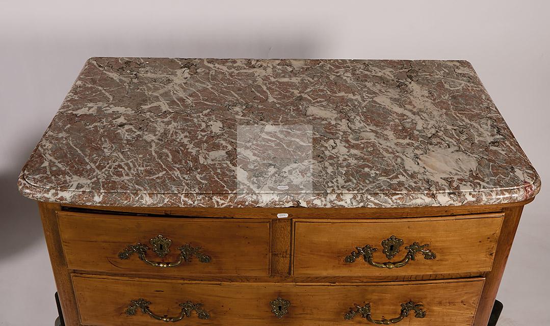 477 Commode à façade légèrement cintrée en merisier et chêne. Elle ouvre à quatre tiroirs sur trois rangs, petits pieds galbés, plateau de marbre veiné (réparé à un angle).