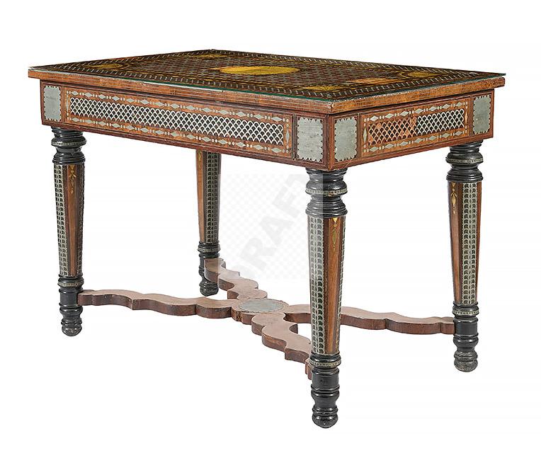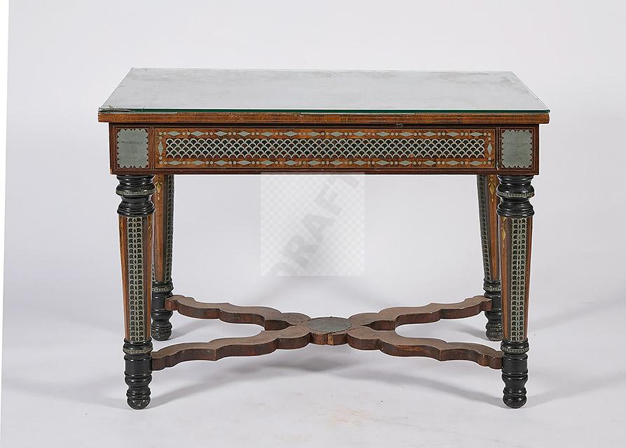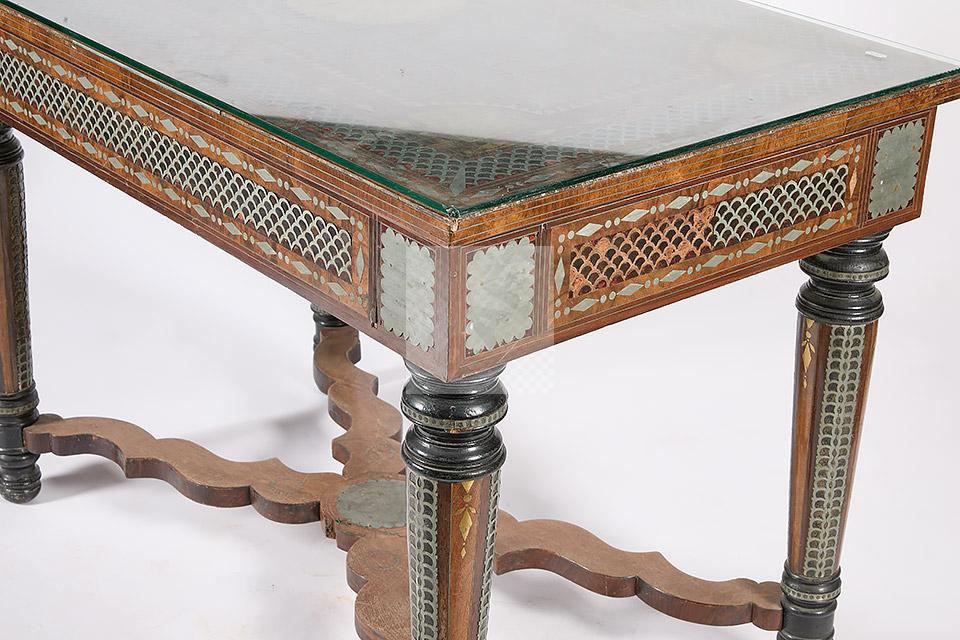 Lot n°481 - 481 Table bureau en noyer et bois de placage marqueté de laiton, étain, à motif