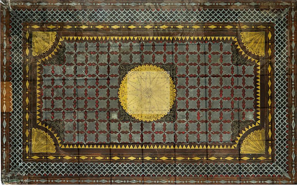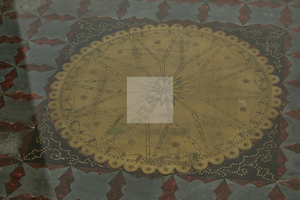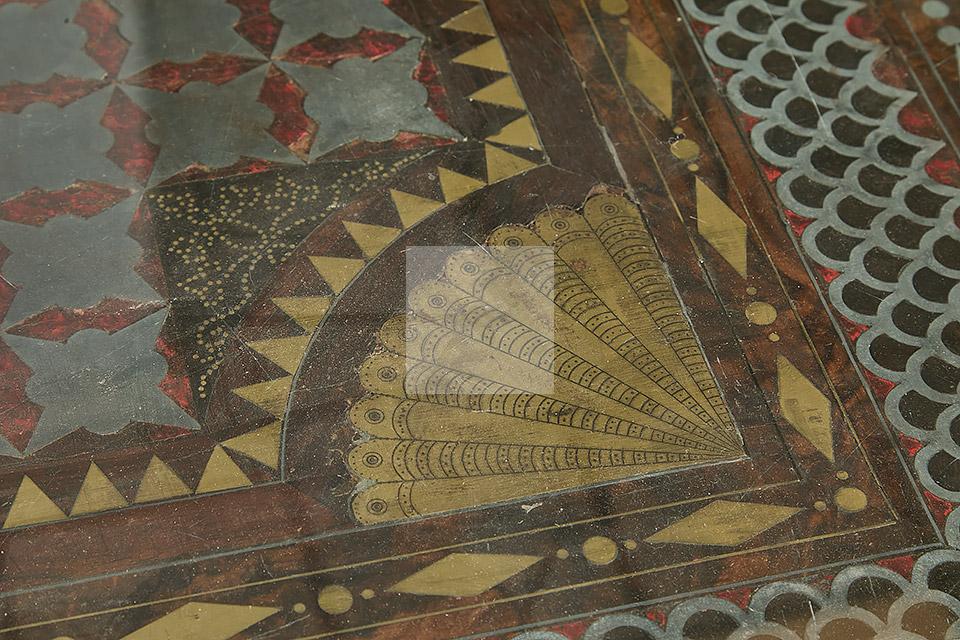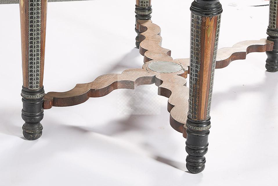 481 Table bureau en noyer et bois de placage marqueté de laiton, étain, à motif central de rosace et motifs stylisés dans des encadrements de filets et motifs d’écailles, ouvre à un tiroir en ceinture, pose sur de hauts pieds fuselés et annelés réunis par une entretoise mouvementée