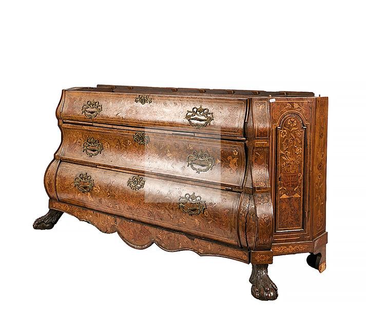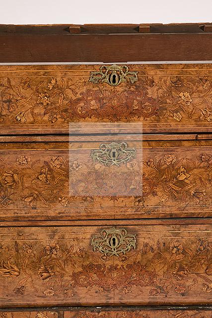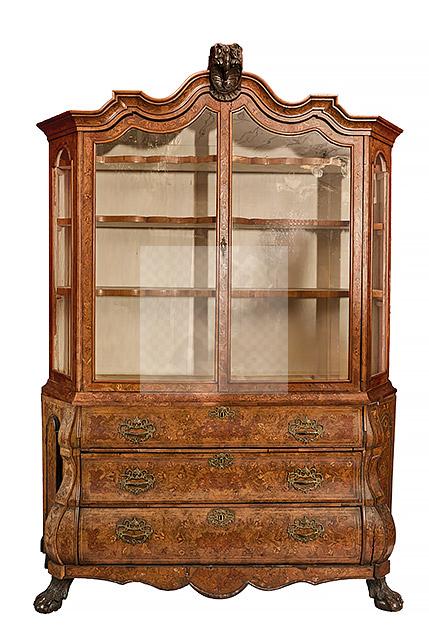 482 Vitrine hollandaise en noyer marqueté de bois clair à décor de personnage, enroulement, fleurs épanouies dans des doubles encadrements de filets de bois clair, elle ouvre par deux vantaux vitrés en partie haute, trois tiroirs et deux vantaux latéraux en partie basse