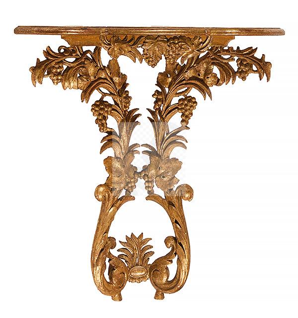 485 Console d’angle en bois sculpté et doré à décor de pampres, grappes de raisin et enroulements.