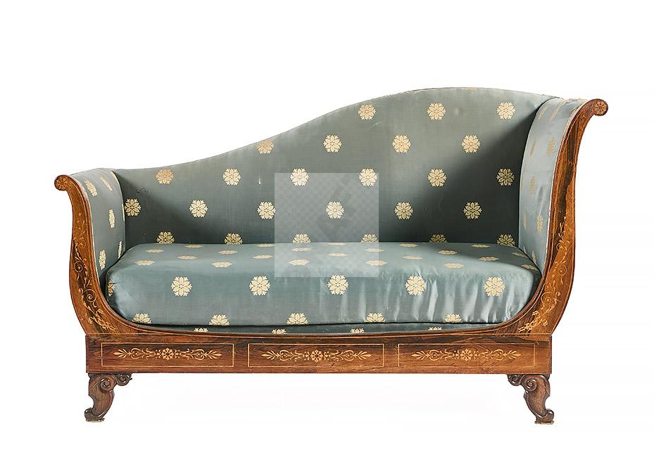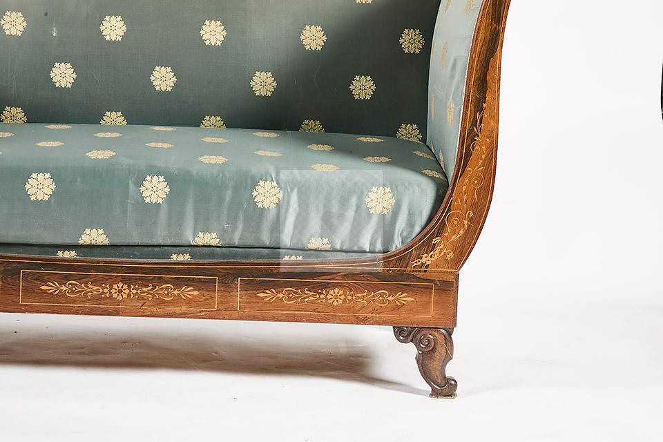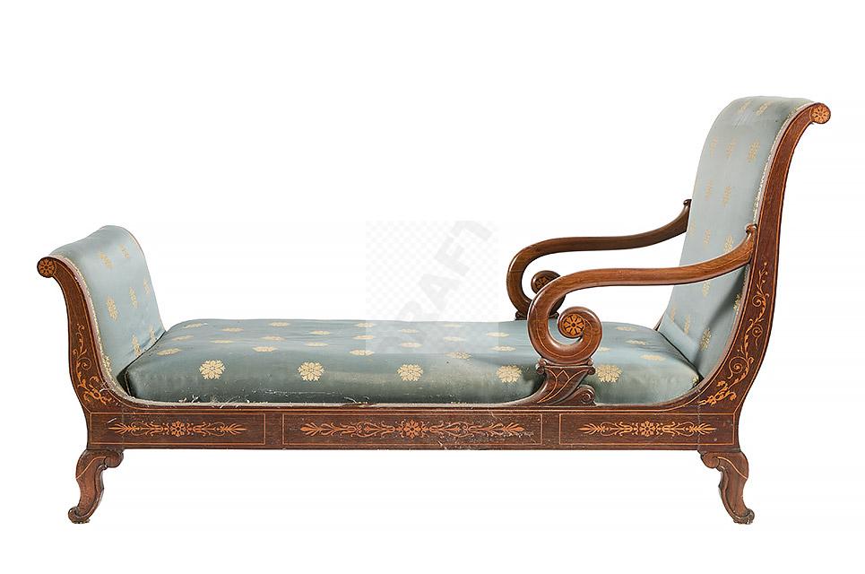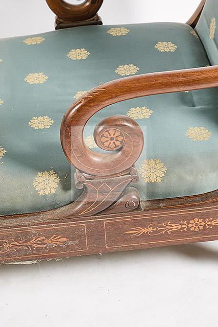 491 Ensemble de mobilier d’époque Charles X à décor marqueté de rosaces, palmettes et enroulements en bois clair sur fond de palissandre dans des encadrements de filets composé de quatre fauteuils, sept chaises, une méridienne (95 x 153 x 66.5cm), une chaise longue (94 x 174 x 79 cm), une console (88 x 80.5 x 42cm)