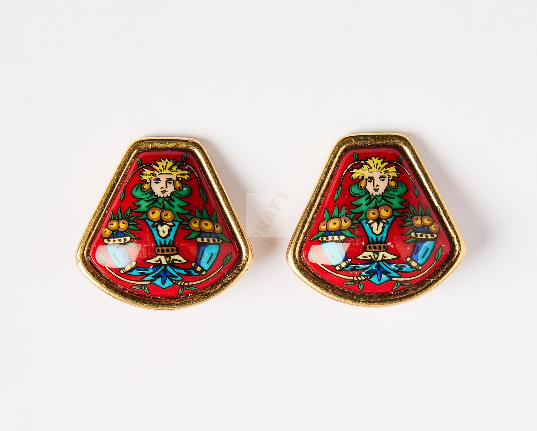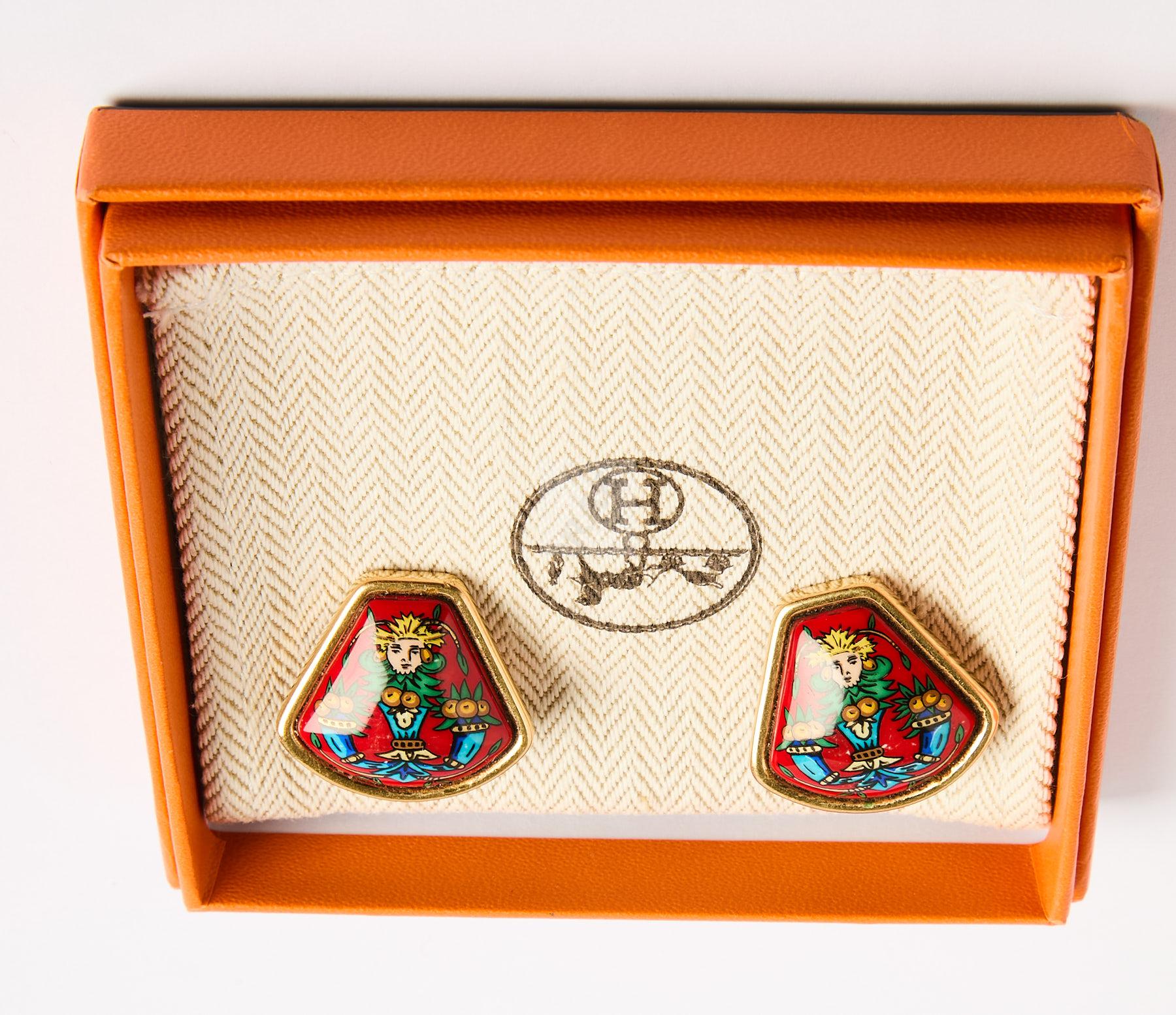 21 HERMES : Paire de clips d’oreilles à décor de faunes et cornes d’abondance ,avec boite d’origine et pochette de voyage