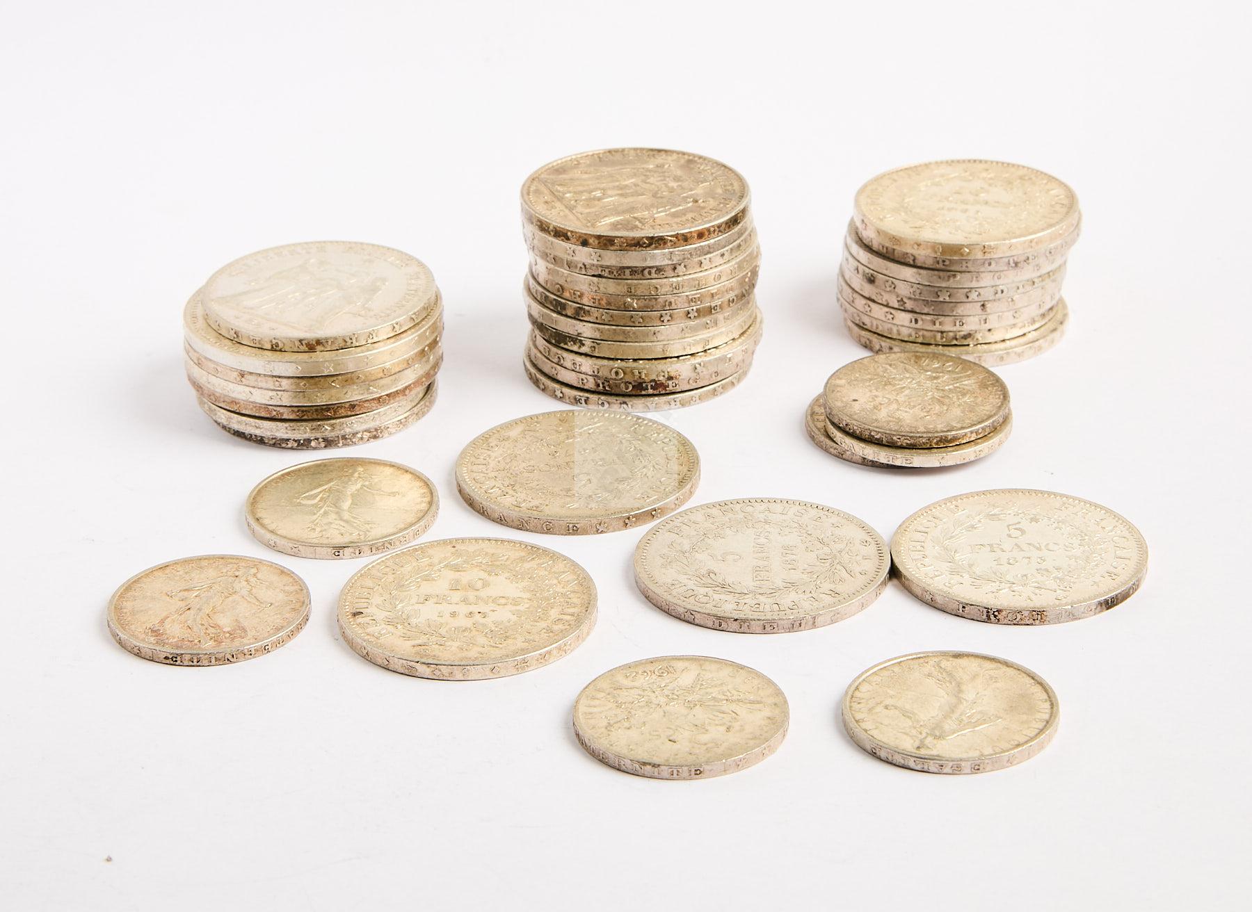 22 Lot de pièces en argent France: 5 Francs Hercule x 21, 50 Francs Hercule x4, 10 Francs Hercule x 5, 5 Francs Semeuse x7.