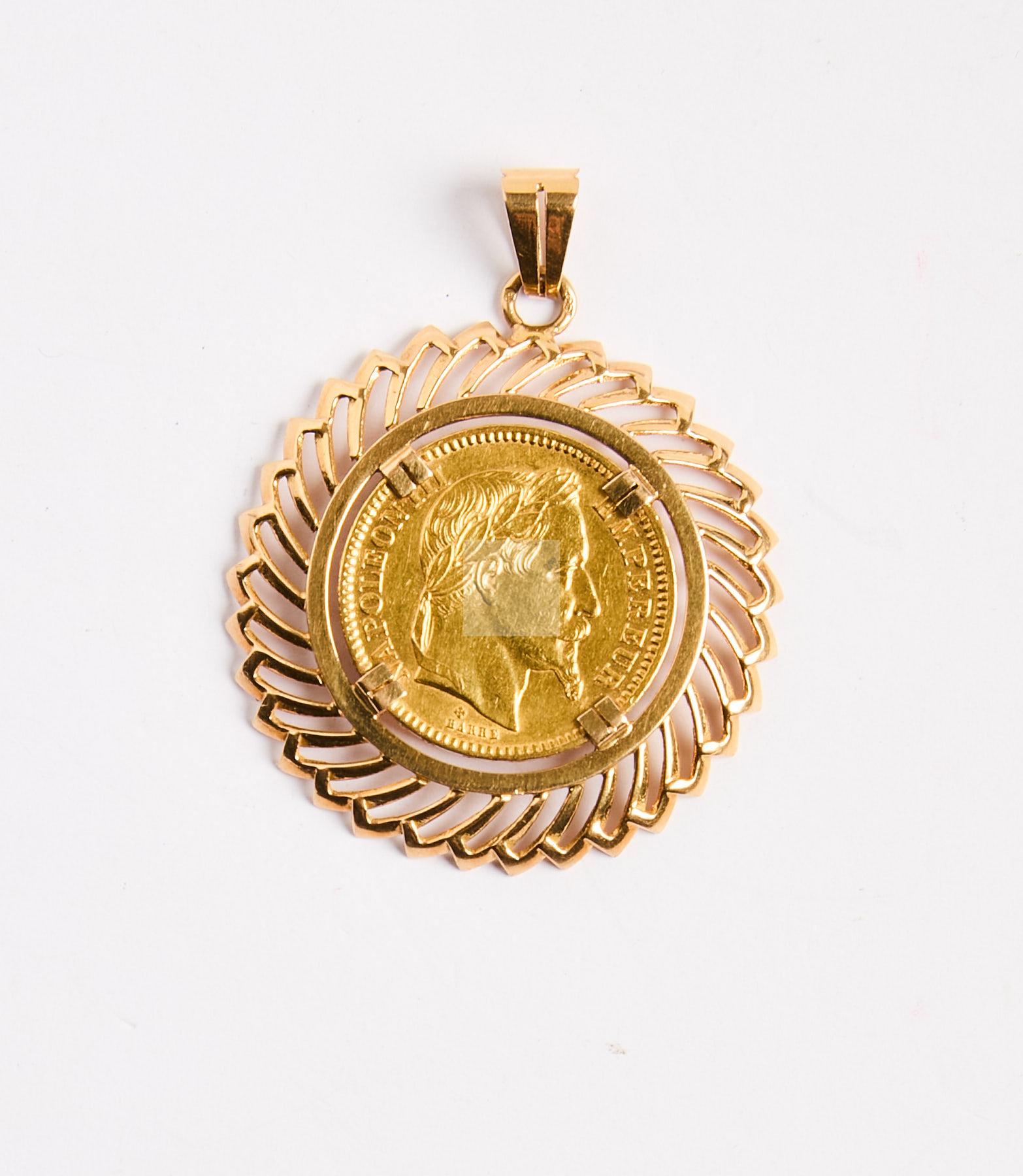 Lot n°32 - 32 Pendentif en or jaune 750/1000 sertie d’une pièce de 20Francs or Napoléon III