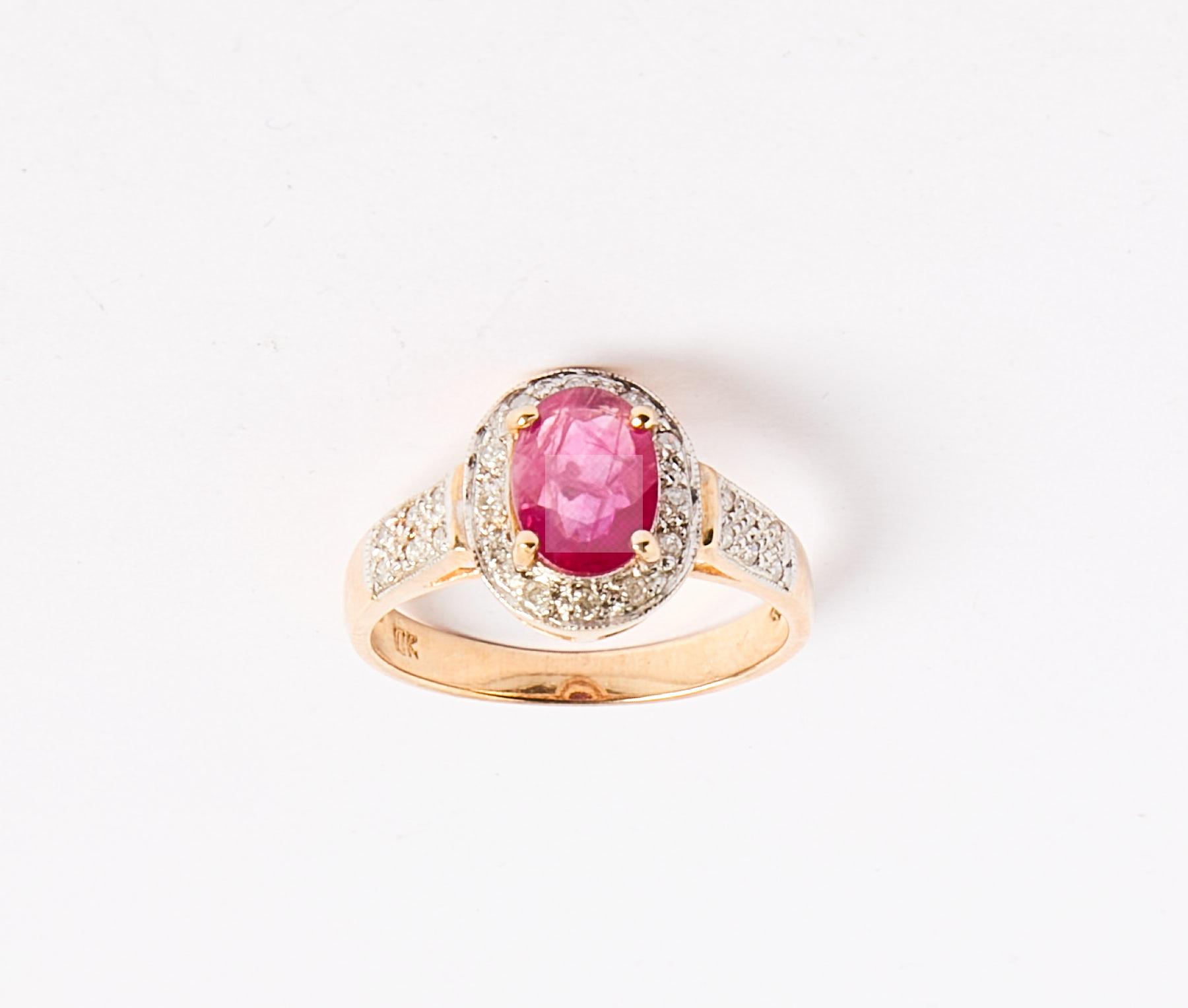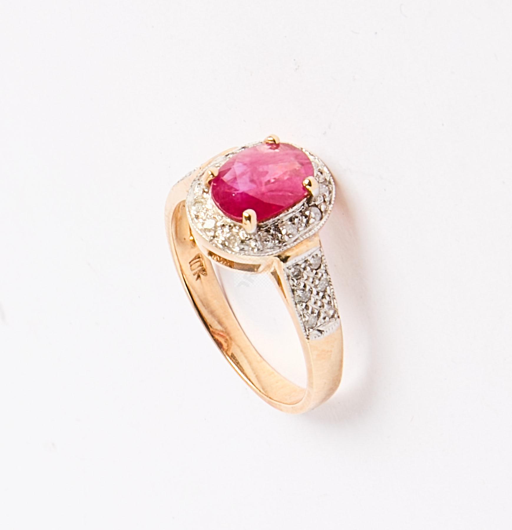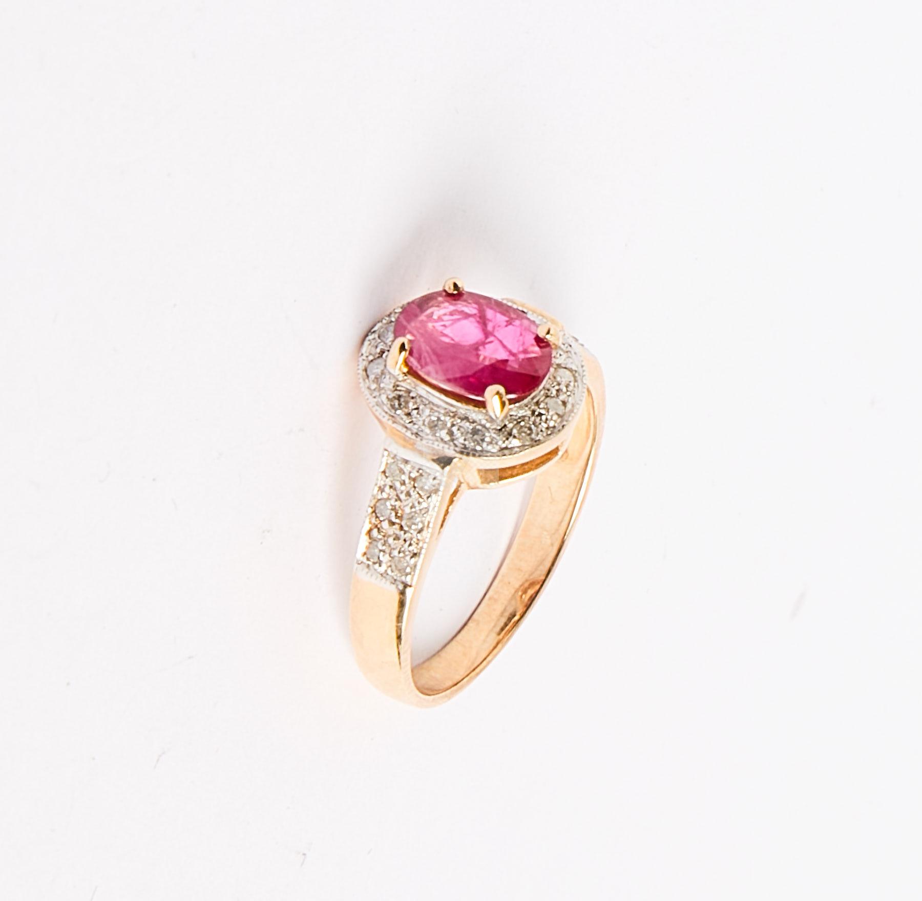 36 Bague pompadour en or jaune 750 ‰ sertie d’un rubis traité entouré de petits diamants, tour de doigt 52 1/2, poids 2,7 g