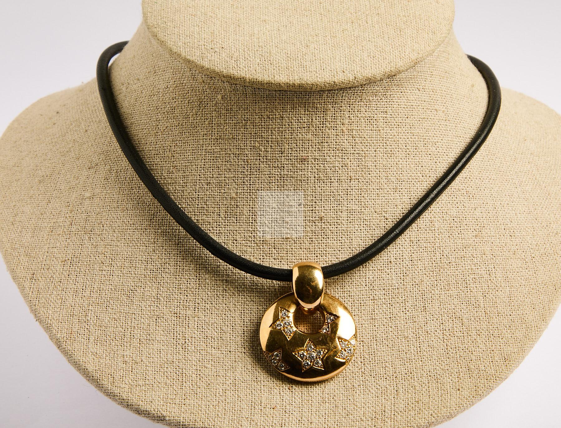69 Pendentif en or jaune 750/1000 à motif d’étoiles serties de diamants, sur cordon cuir.