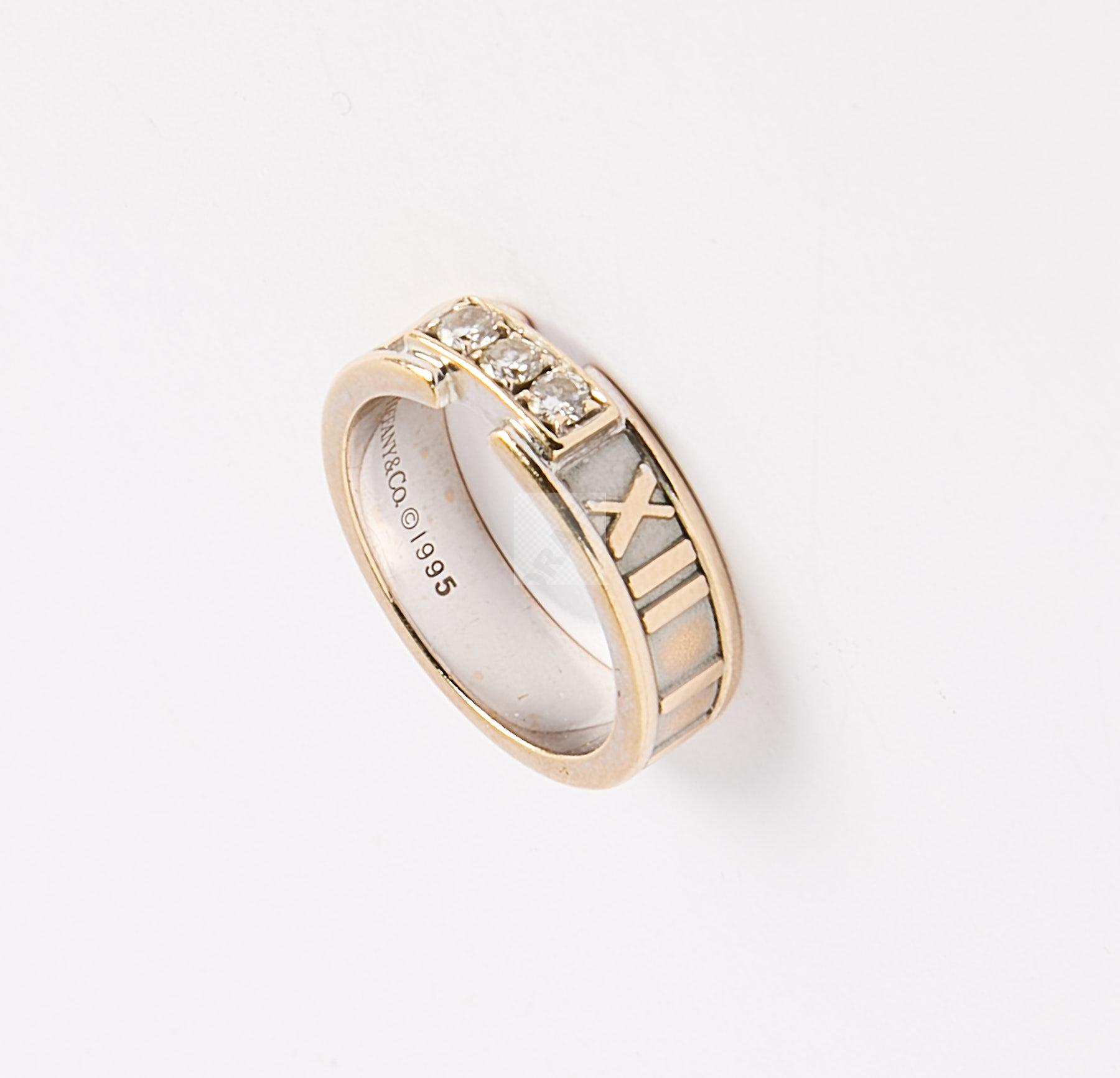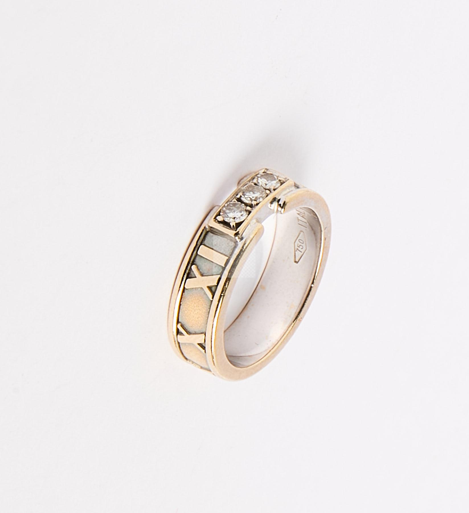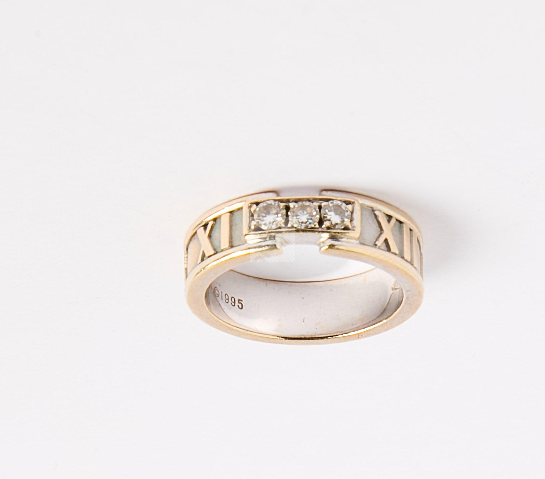 72 TIFFANY : Bague ruban trilogie deux ors 750 ‰ sertie de 3 diamants brillantés et entourée de chiffres romains, signée, tour de doigt 51, poids 7,1 g