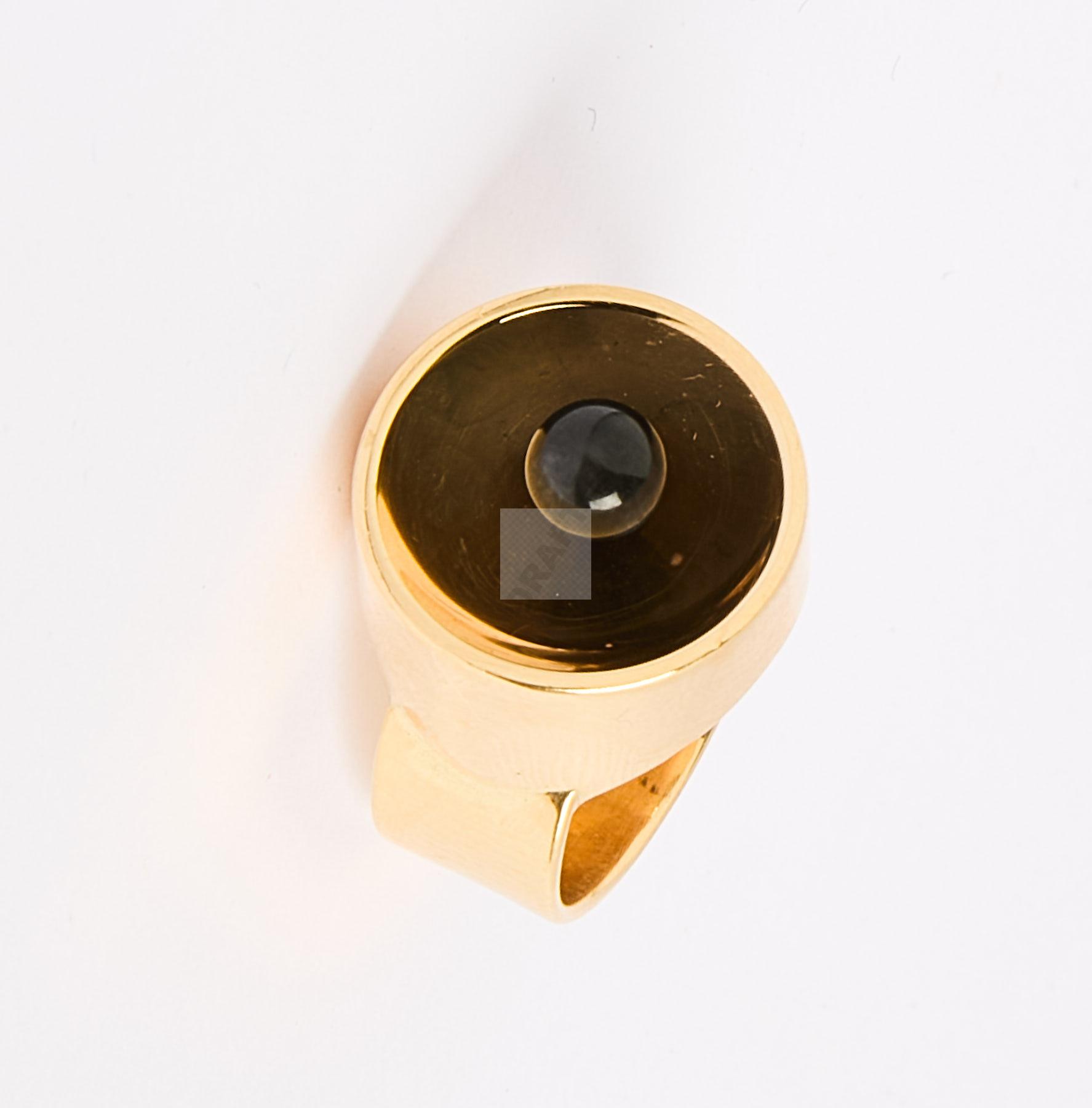 73 DINH VAN : Bague en or jaune 750 ‰ ornée d’une petite boule de pierre dure dans une cupule, tour de doigt 52, poids 13,4 g
