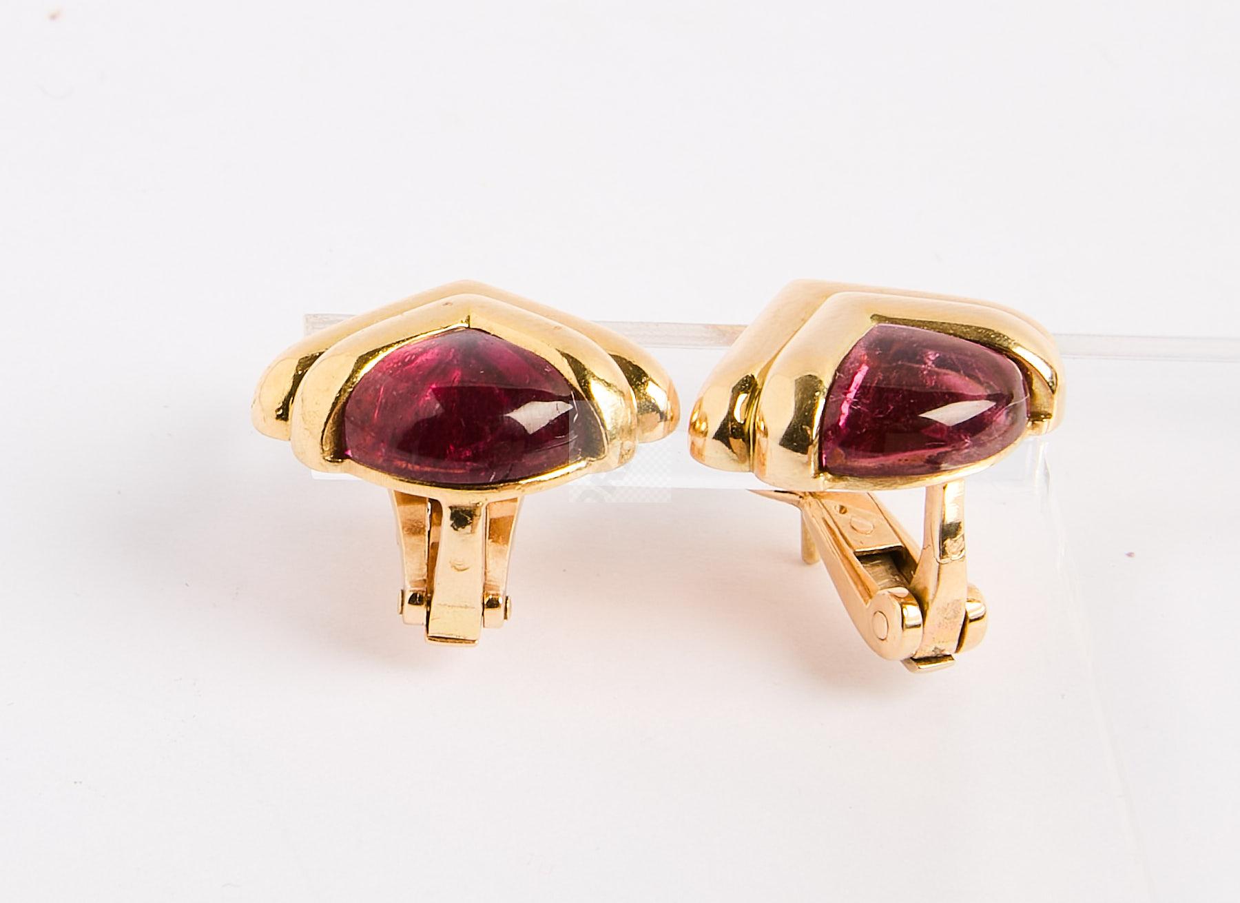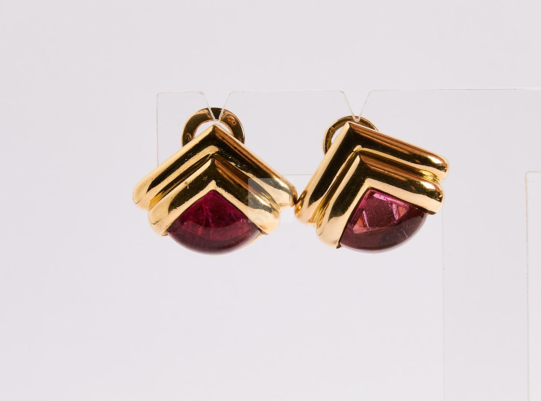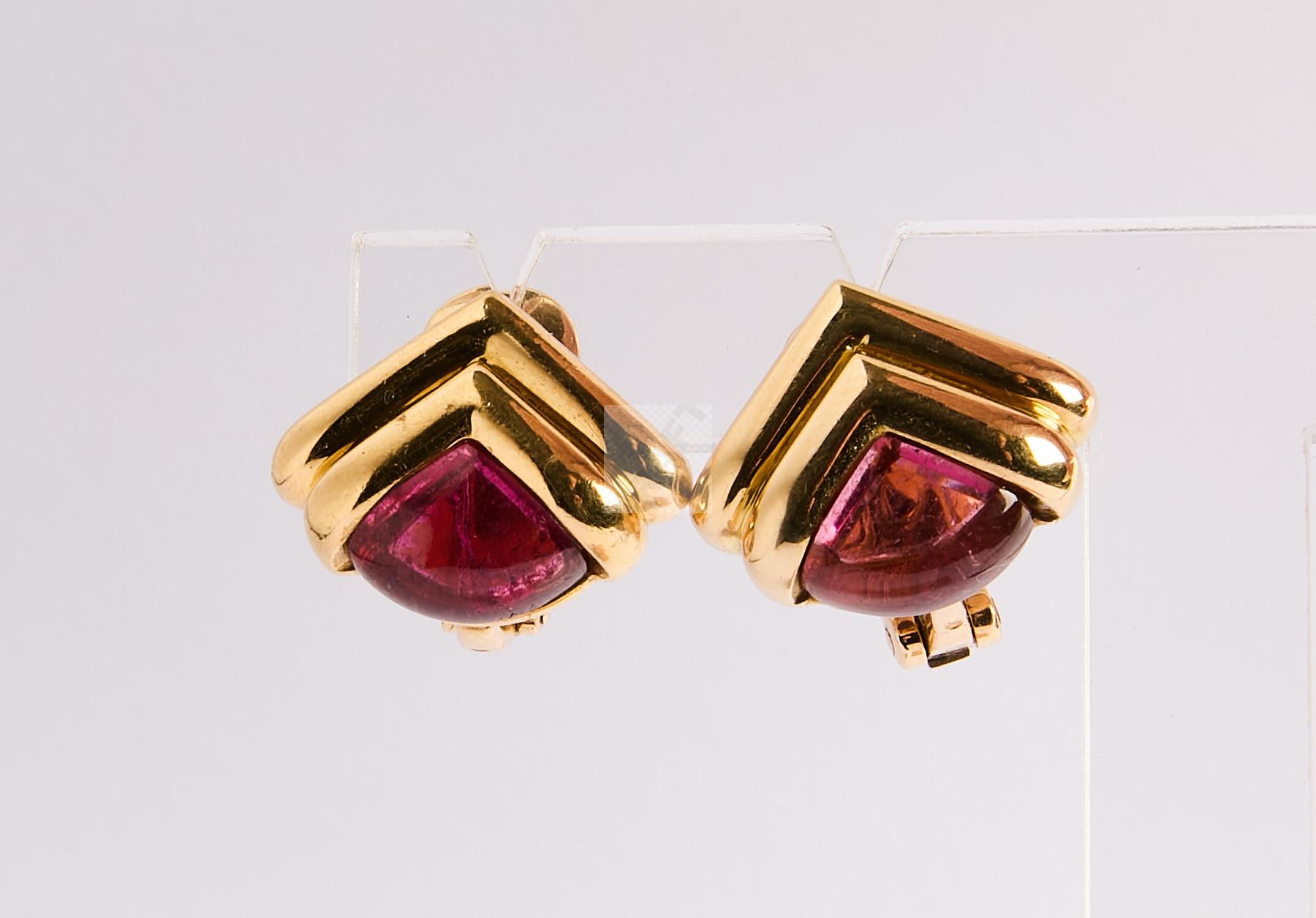 74 BULGARI :Paire de boucles d’oreilles en or 750 ‰ or ornées de cabochons de tourmalines roses, systèmes clips pour oreilles percées, signés, poids 21,4 g