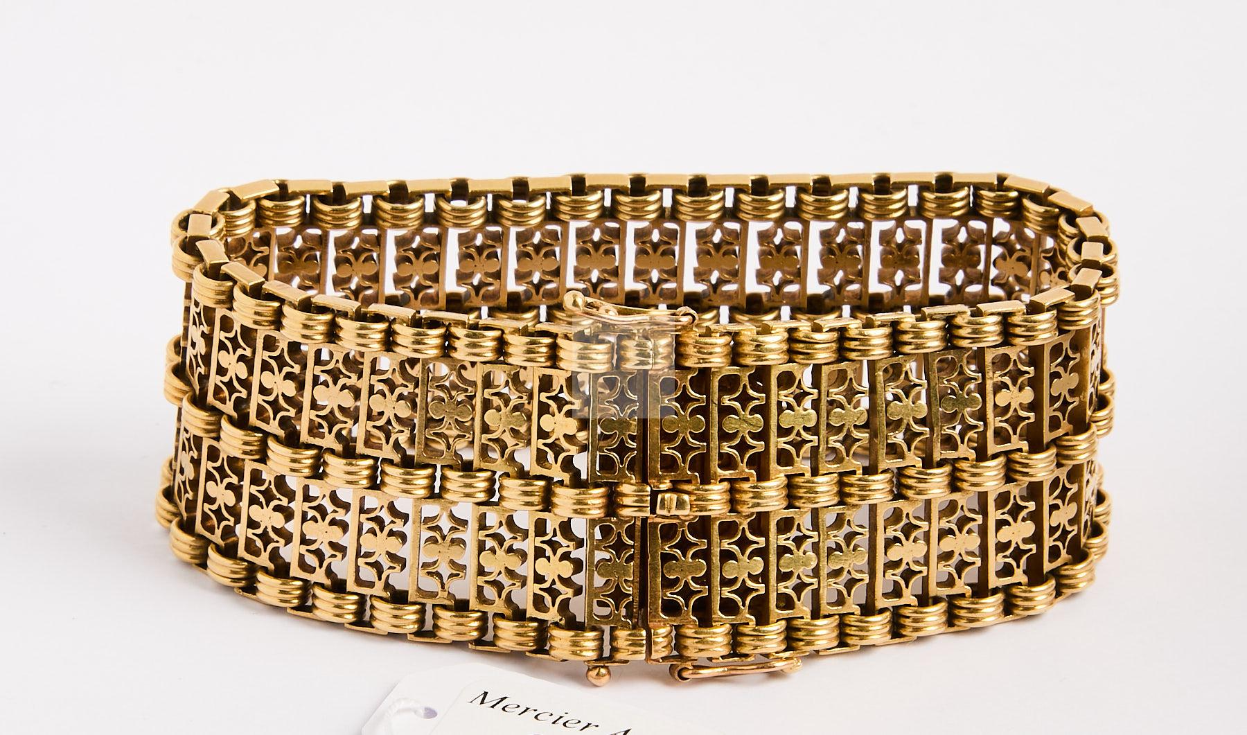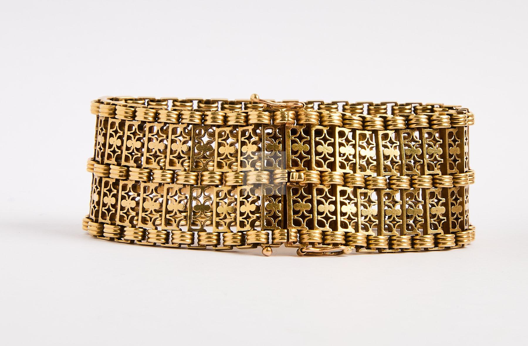 95 Bracelet manchette en or jaune 750 ‰ , mailles ajourées, Longueur 20 cm, largeur 3 cm, poids 109,07 g