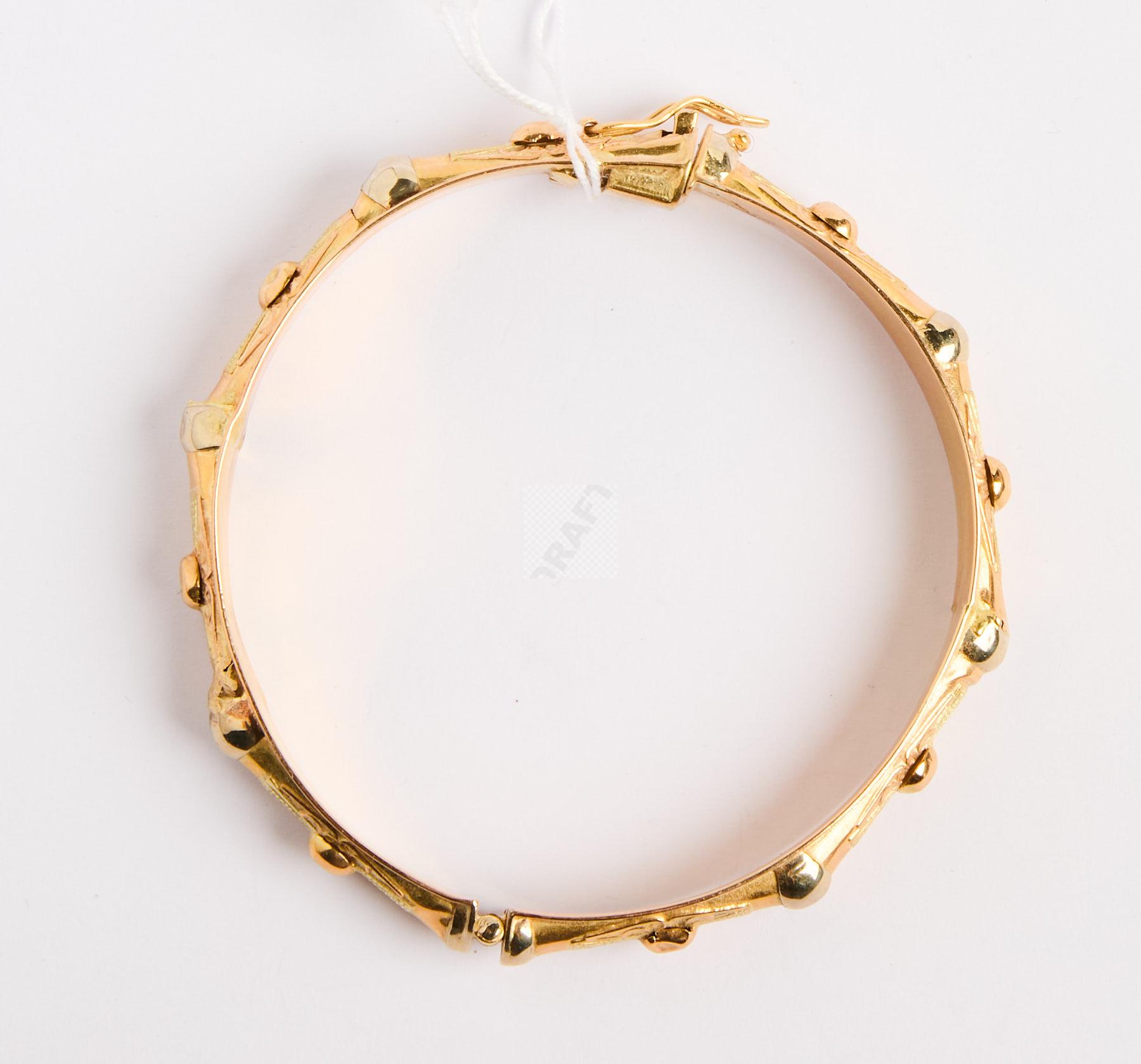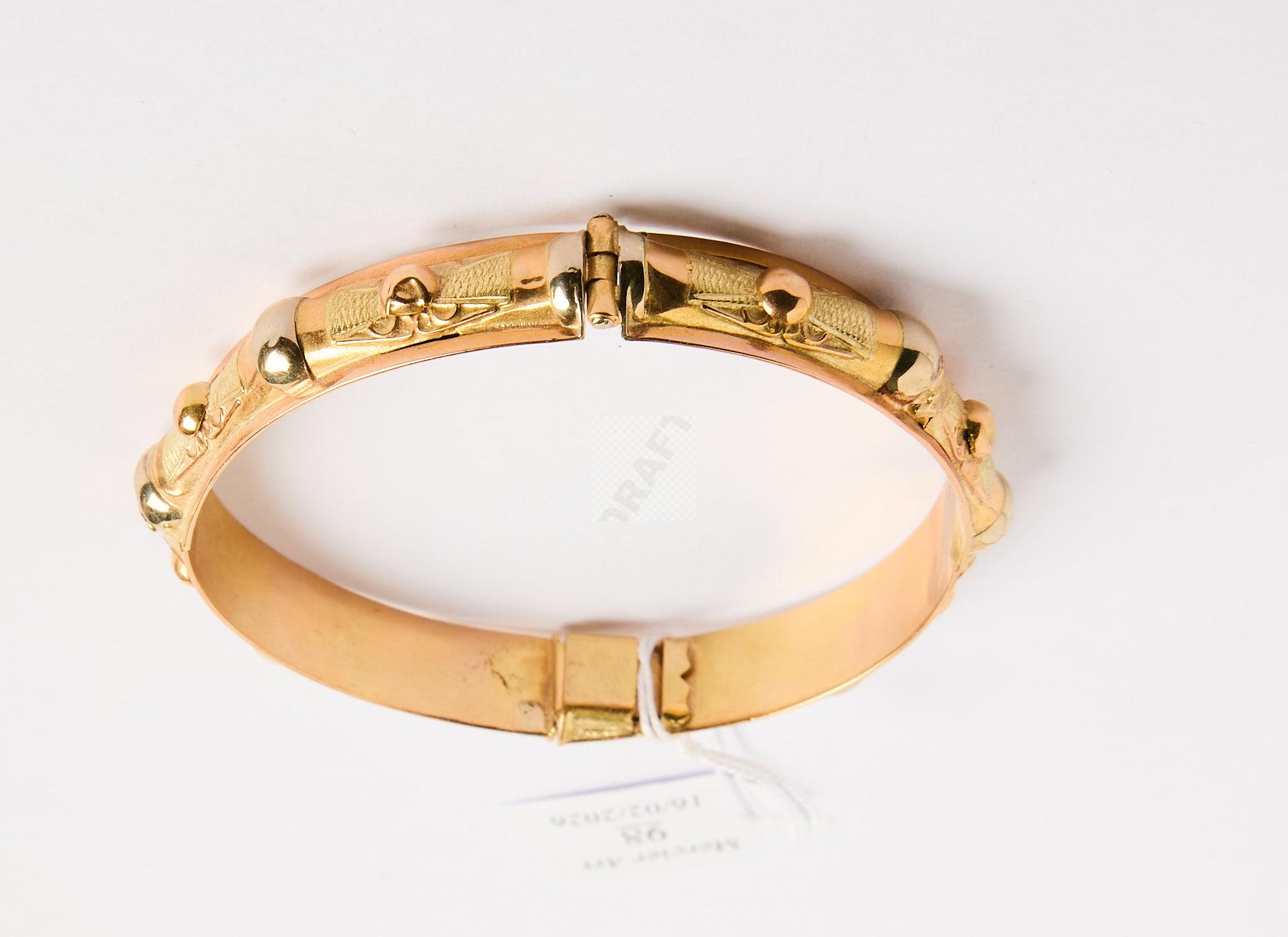 Lot n°98 - 98 Bracelet jonc rigide ouvrant à boules et motifs stylisés, or jaune 750 ‰, pe