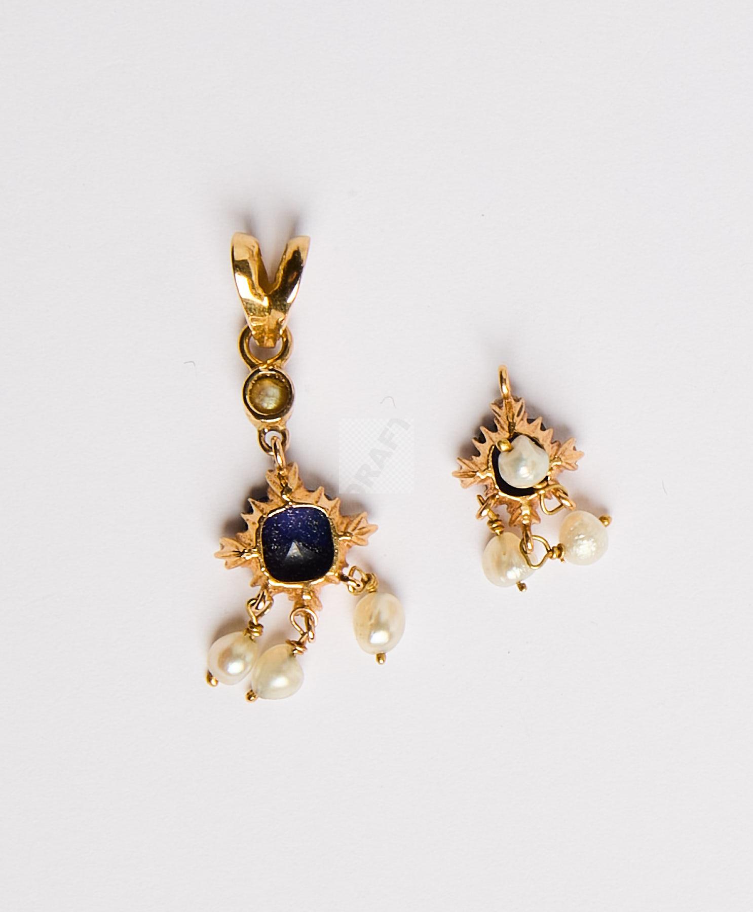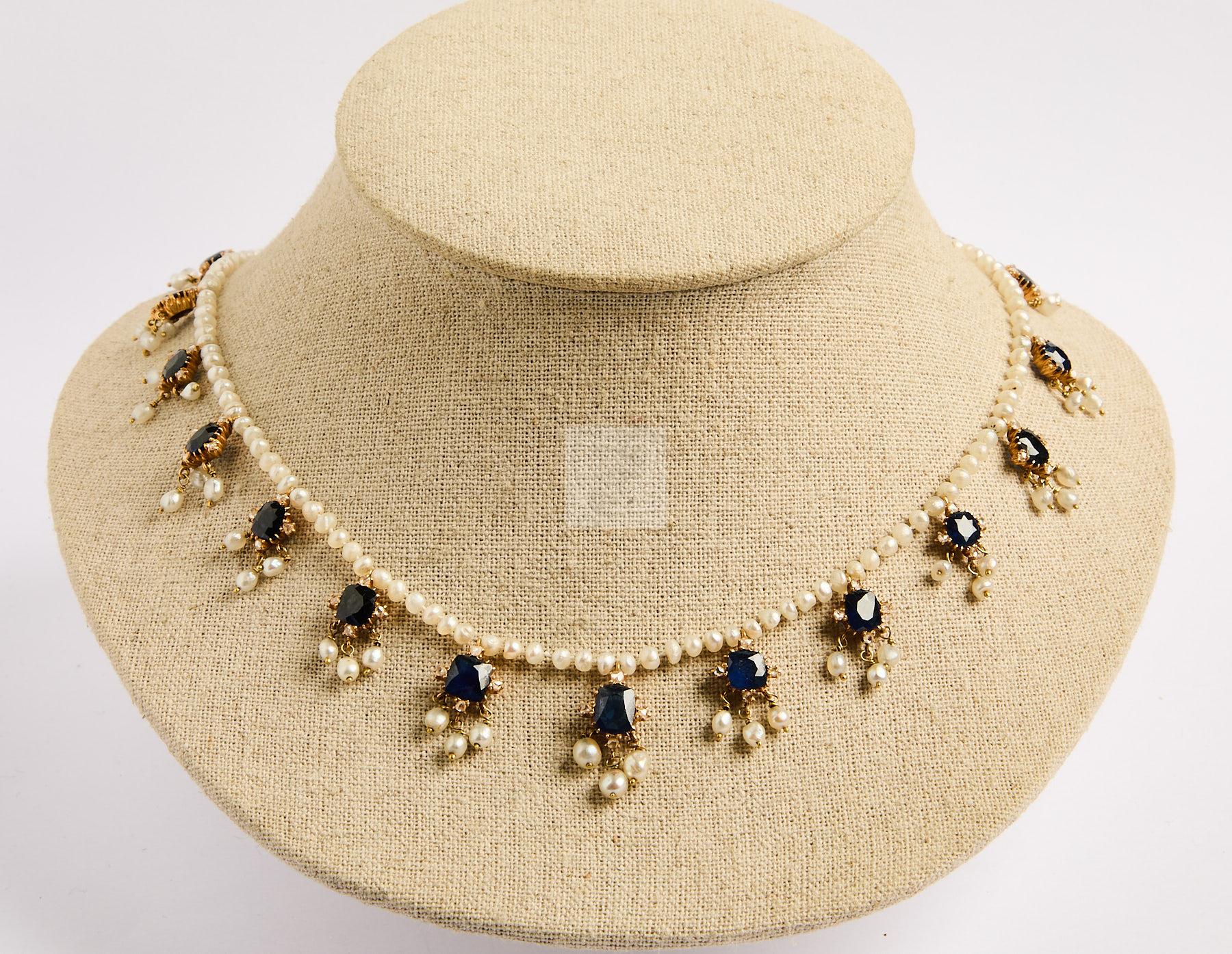 99 Collier draperie de petites perles fines baroques orné de 18 éléments en or jaune 750 ‰ sertis de saphirs et petites roses de diamants , longueur 48 cm, on joint un élément et un pendentif au modèle, poids brut 28,2 g