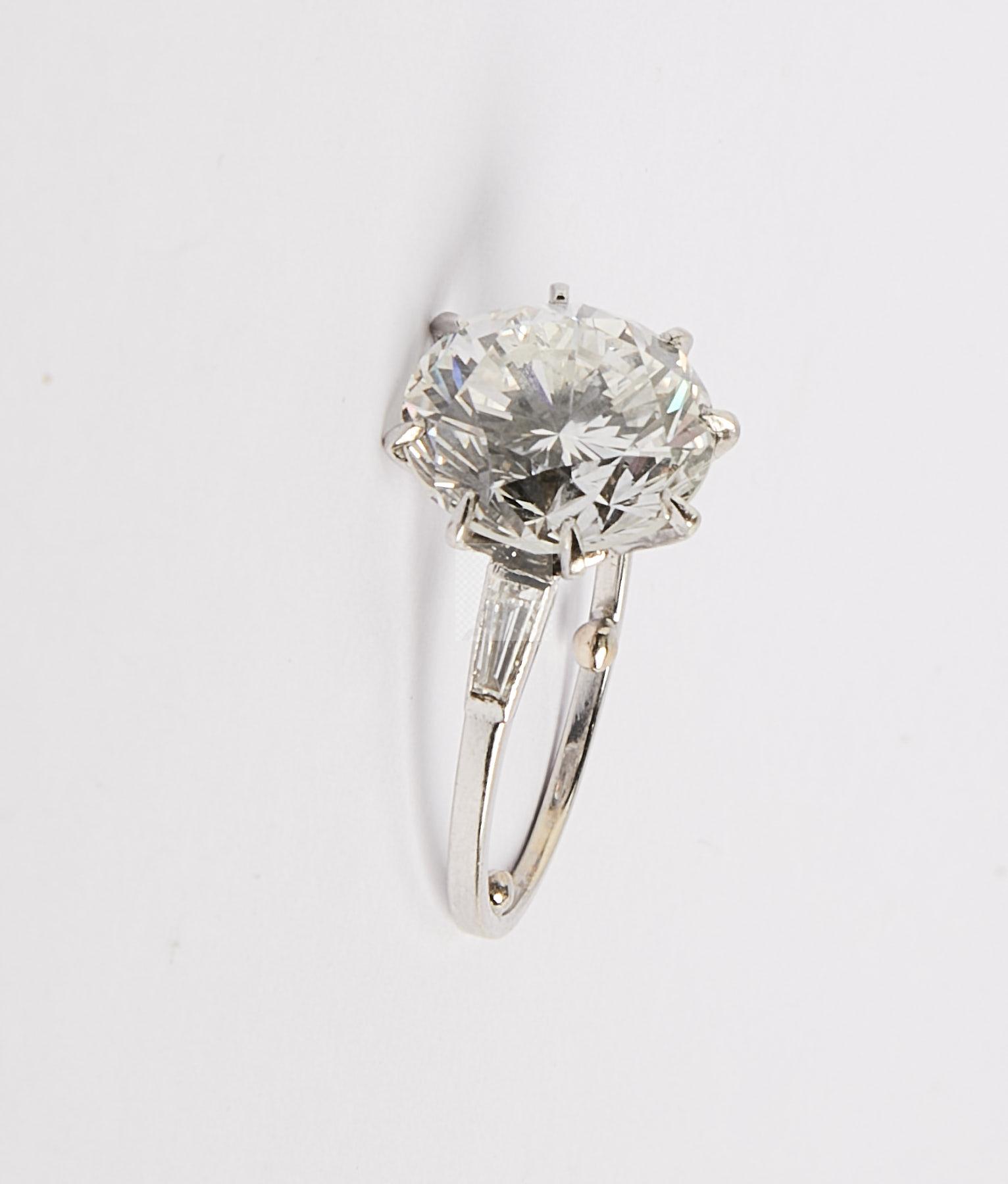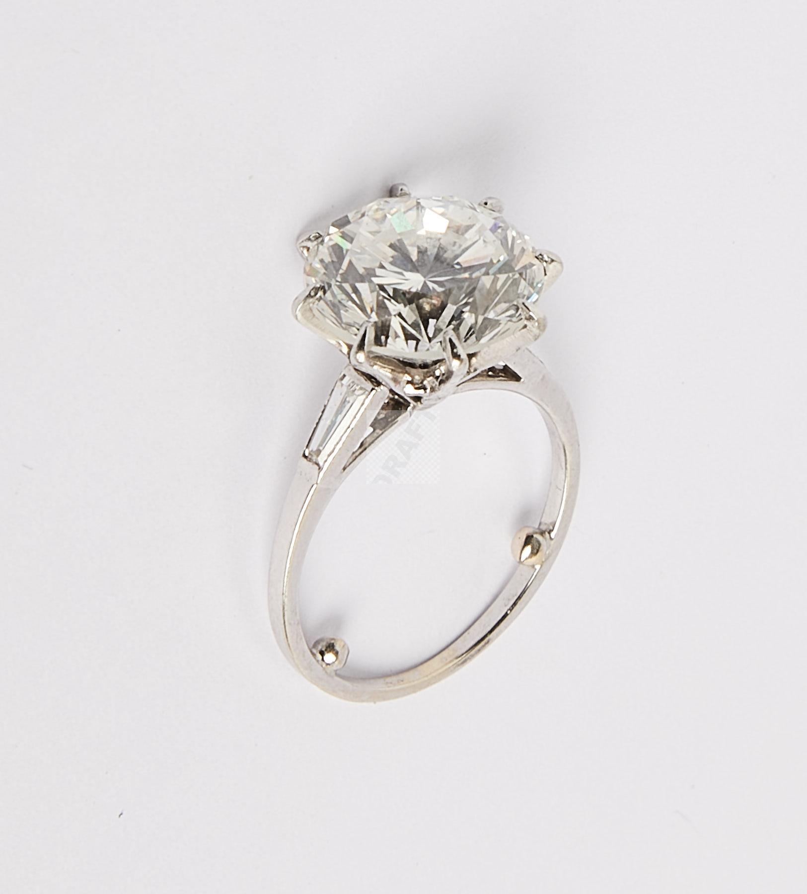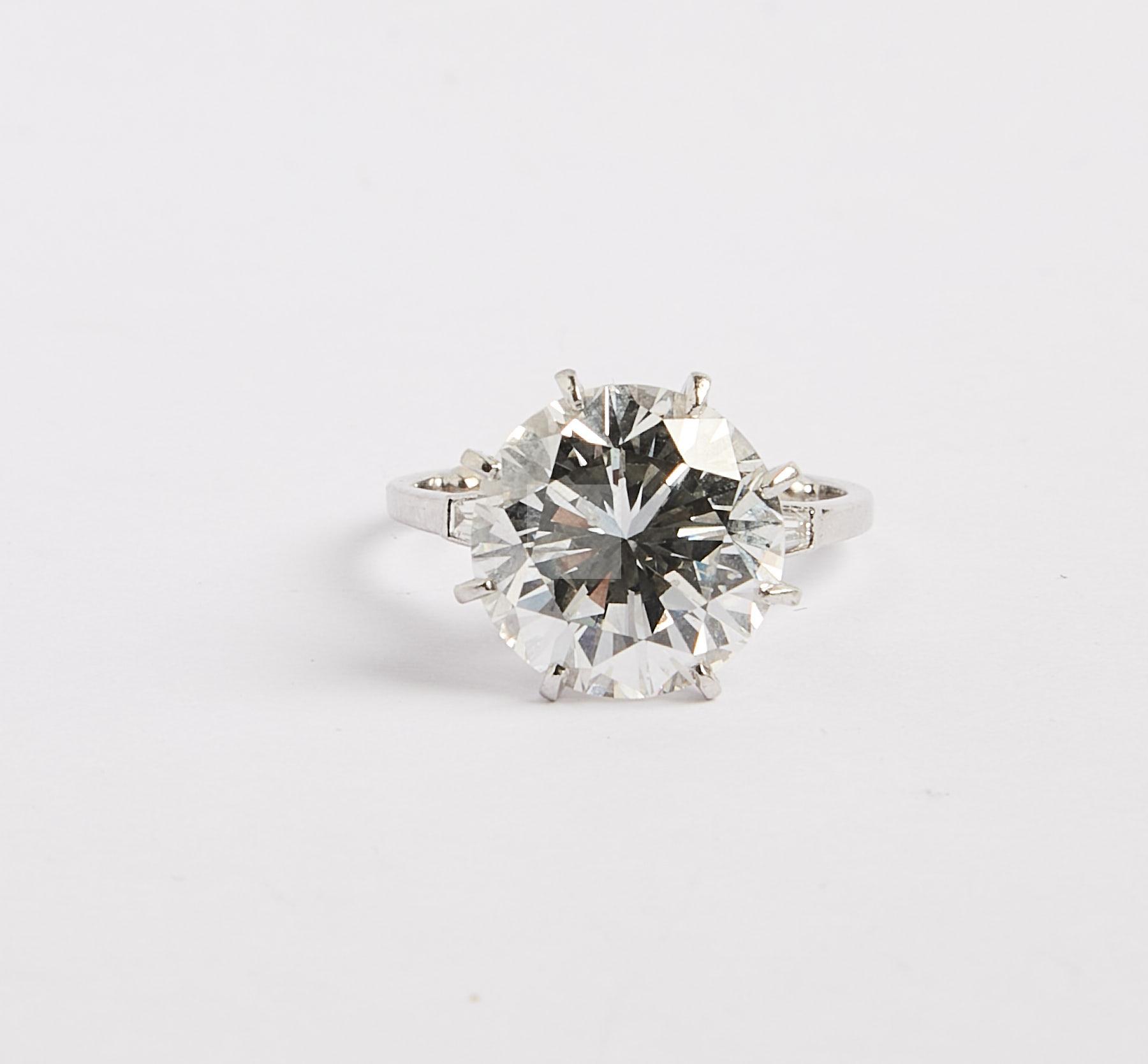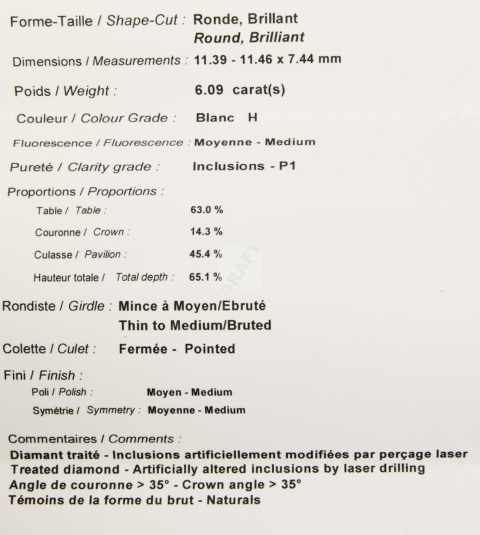 100 Bague en or gris et platine sertie d’un diamant brillanté de taille moderne d’un poids de 6,09 ct accompagné de son certificat LFG attestant d’un couleur H et d’une pureté P1, luminescence moyenne, tour de doigt avec rétrécisseurs 47, poids brut 4 g