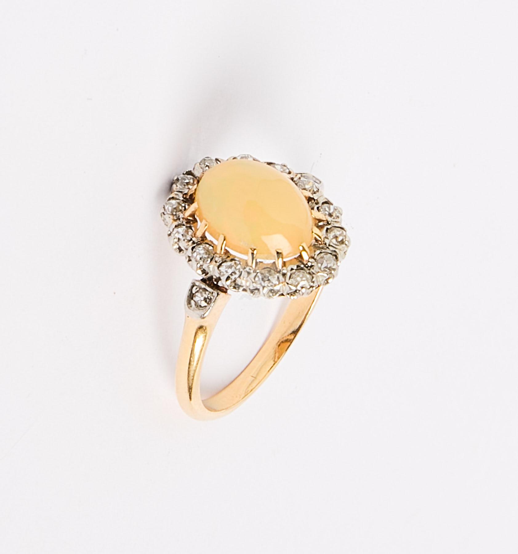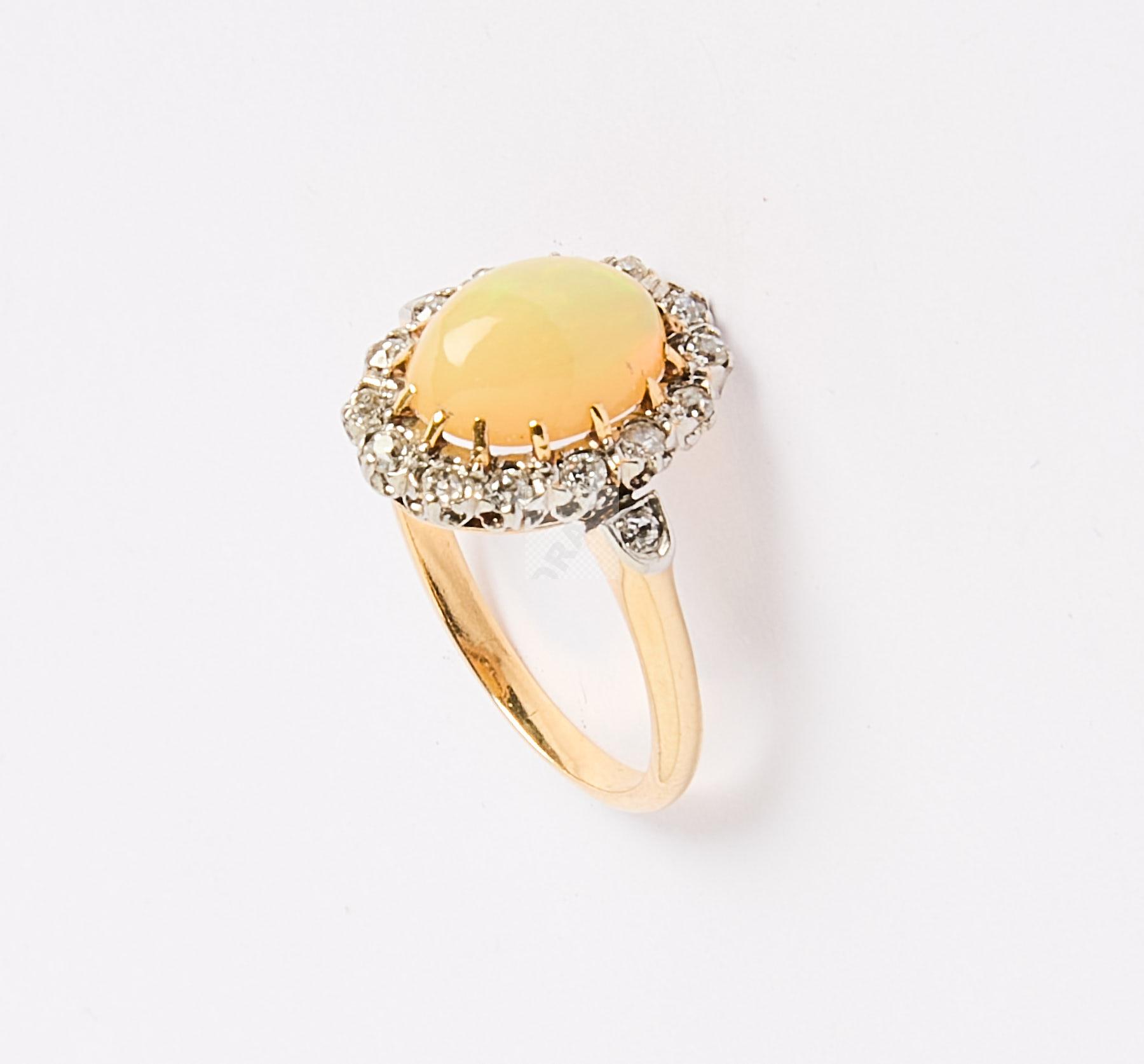 Lot n°116 - 116 Bague en or 750 ‰ ornée d’une opale cabochon entourée et épaulée de diamants