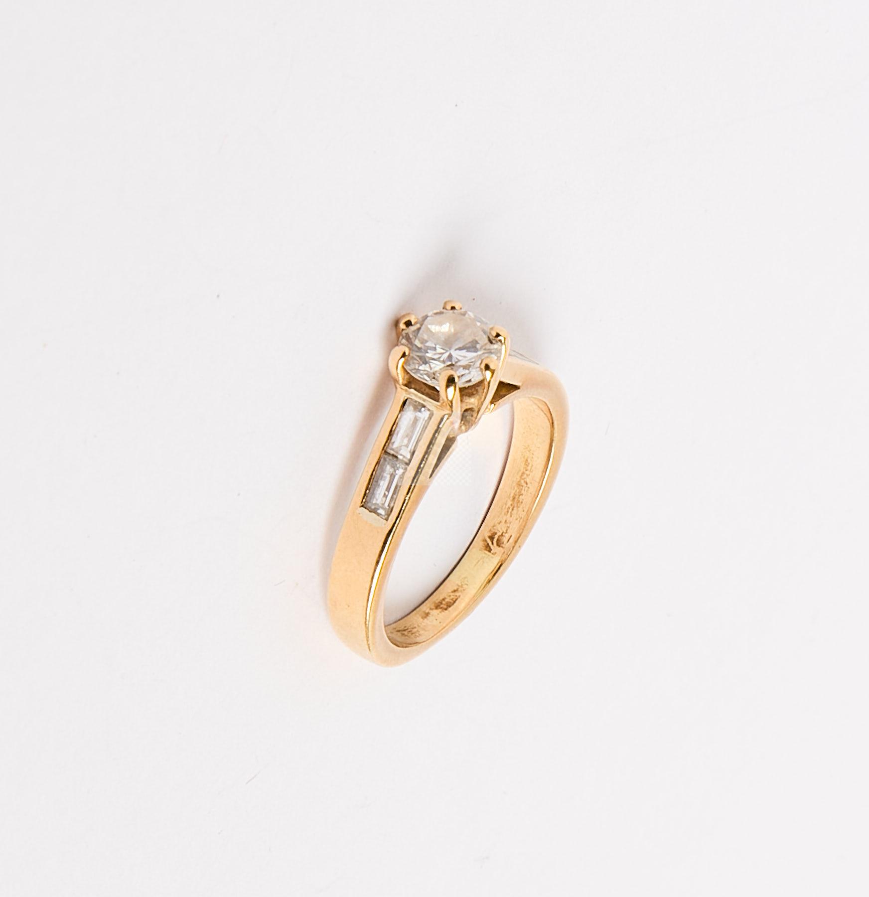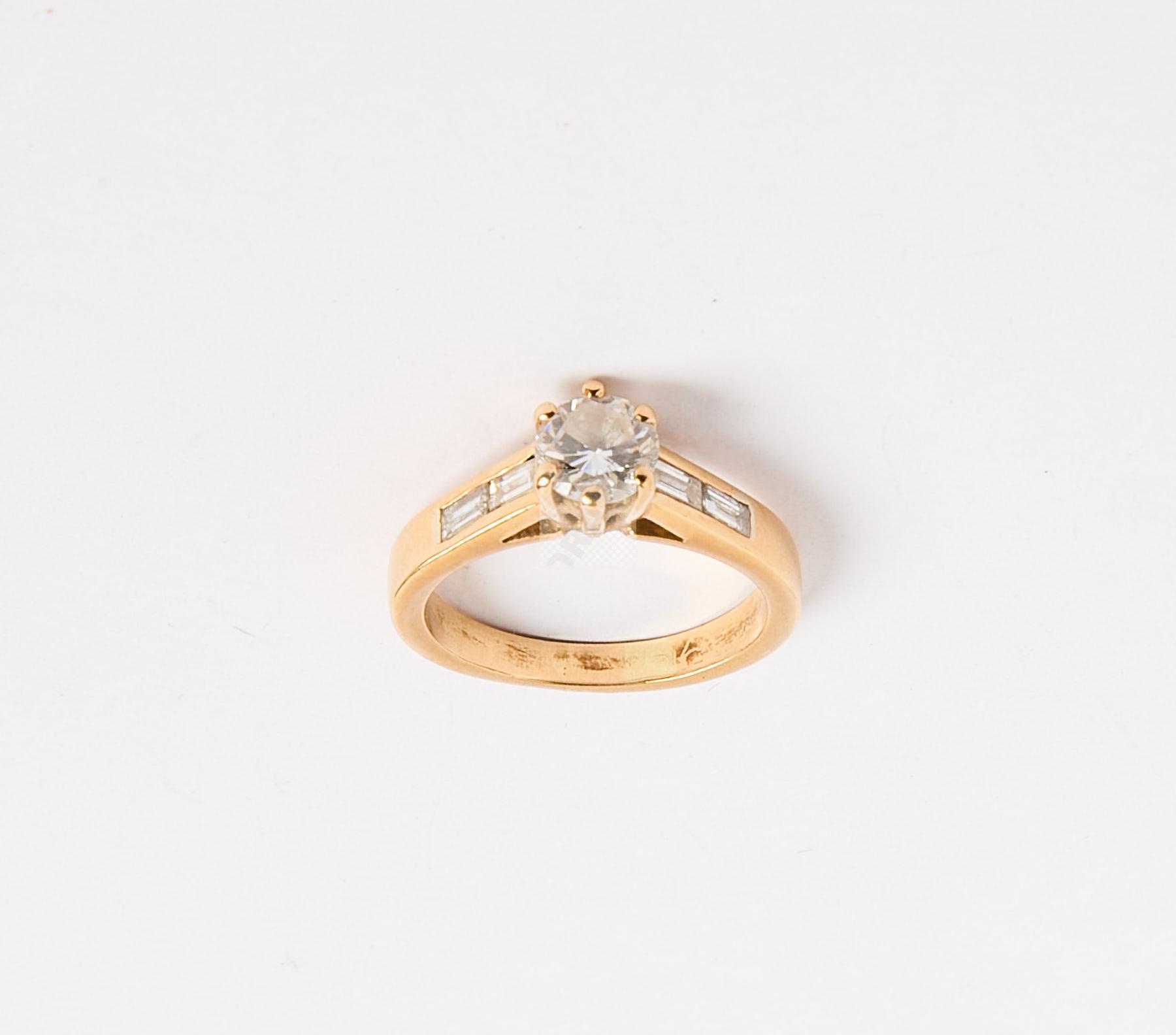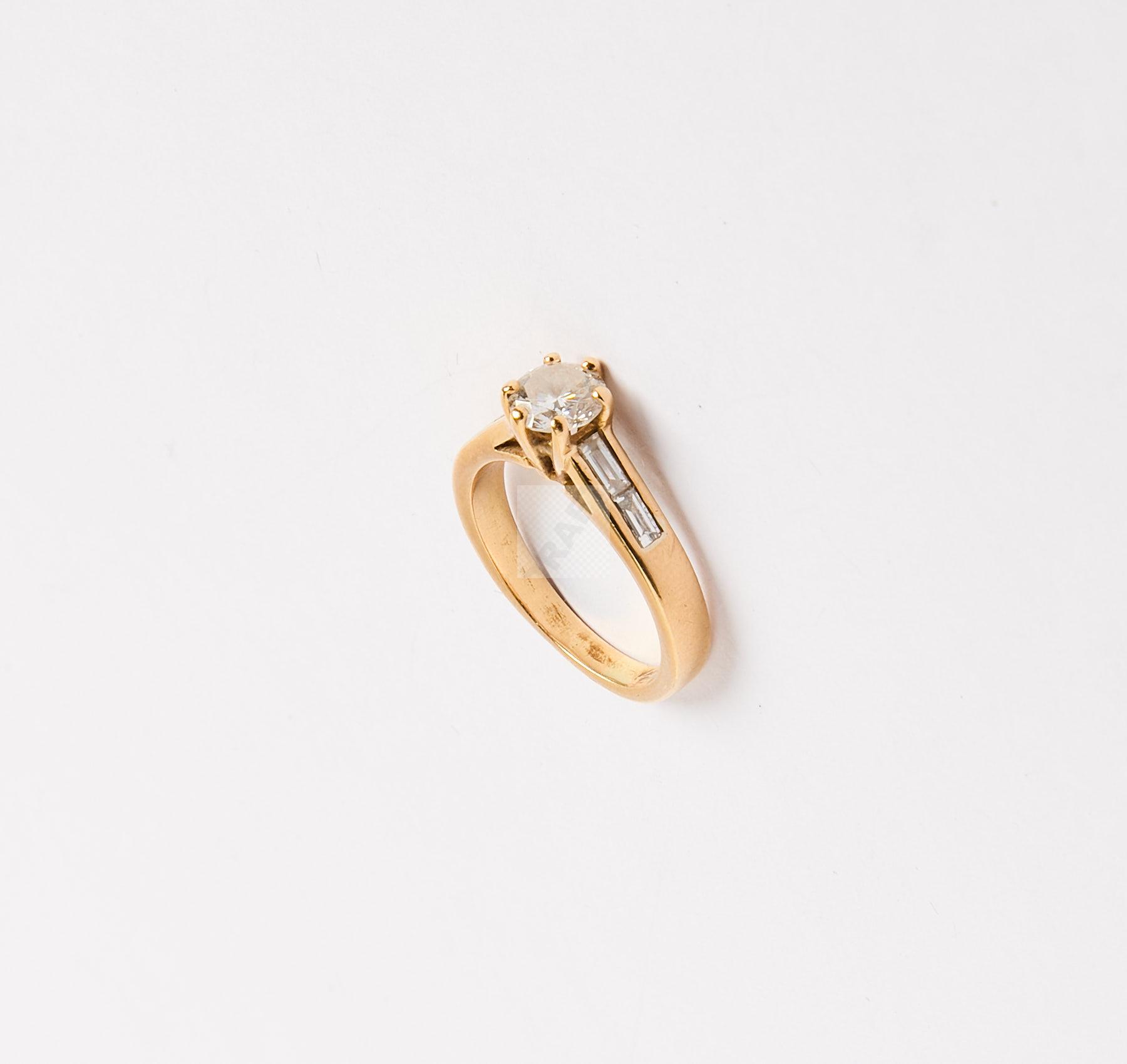 117 Solitaire en or jaune 750/1000 sertie d’un diamant d’environ 0.70ct et de diamants baguettes en épaulement.