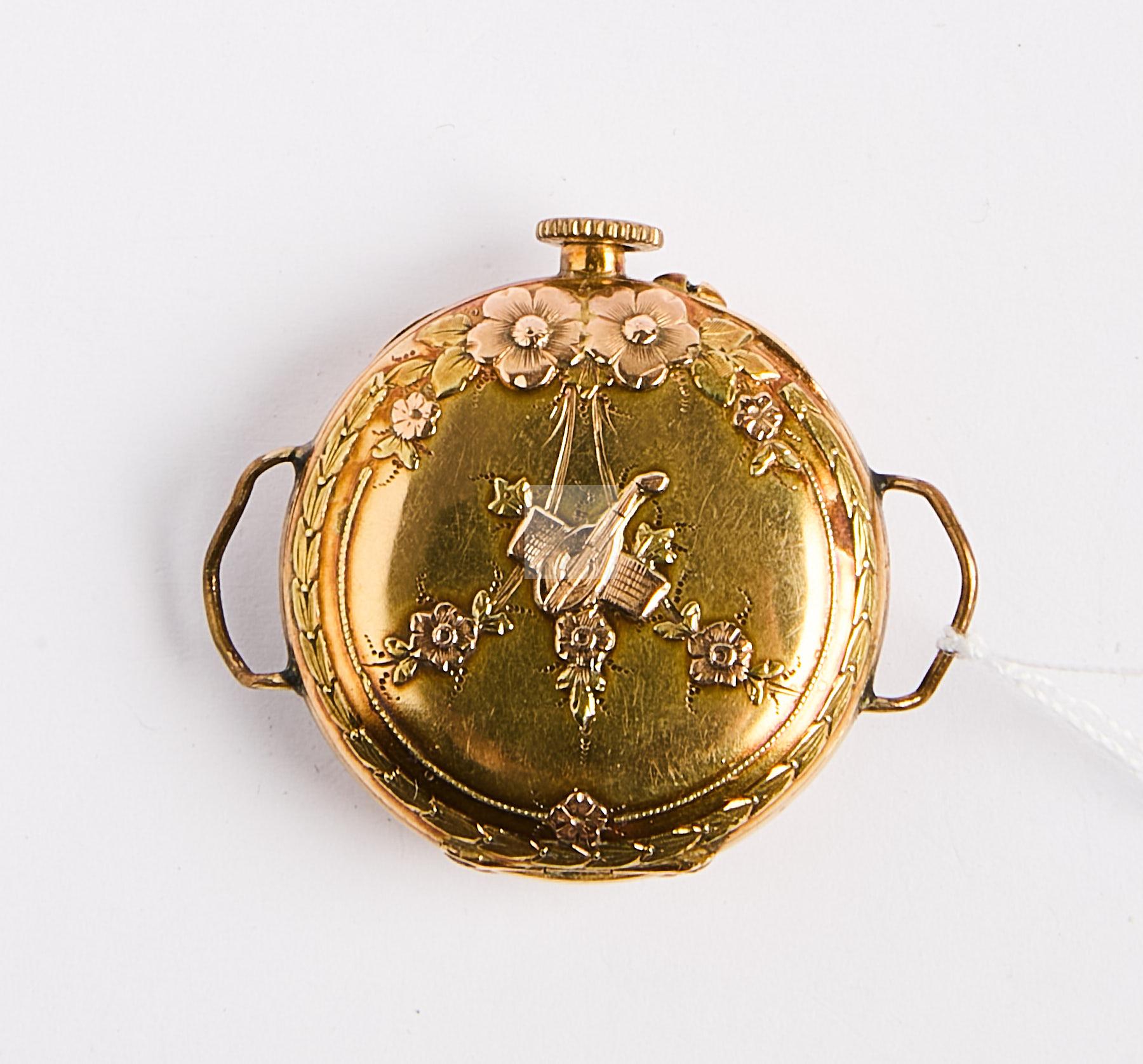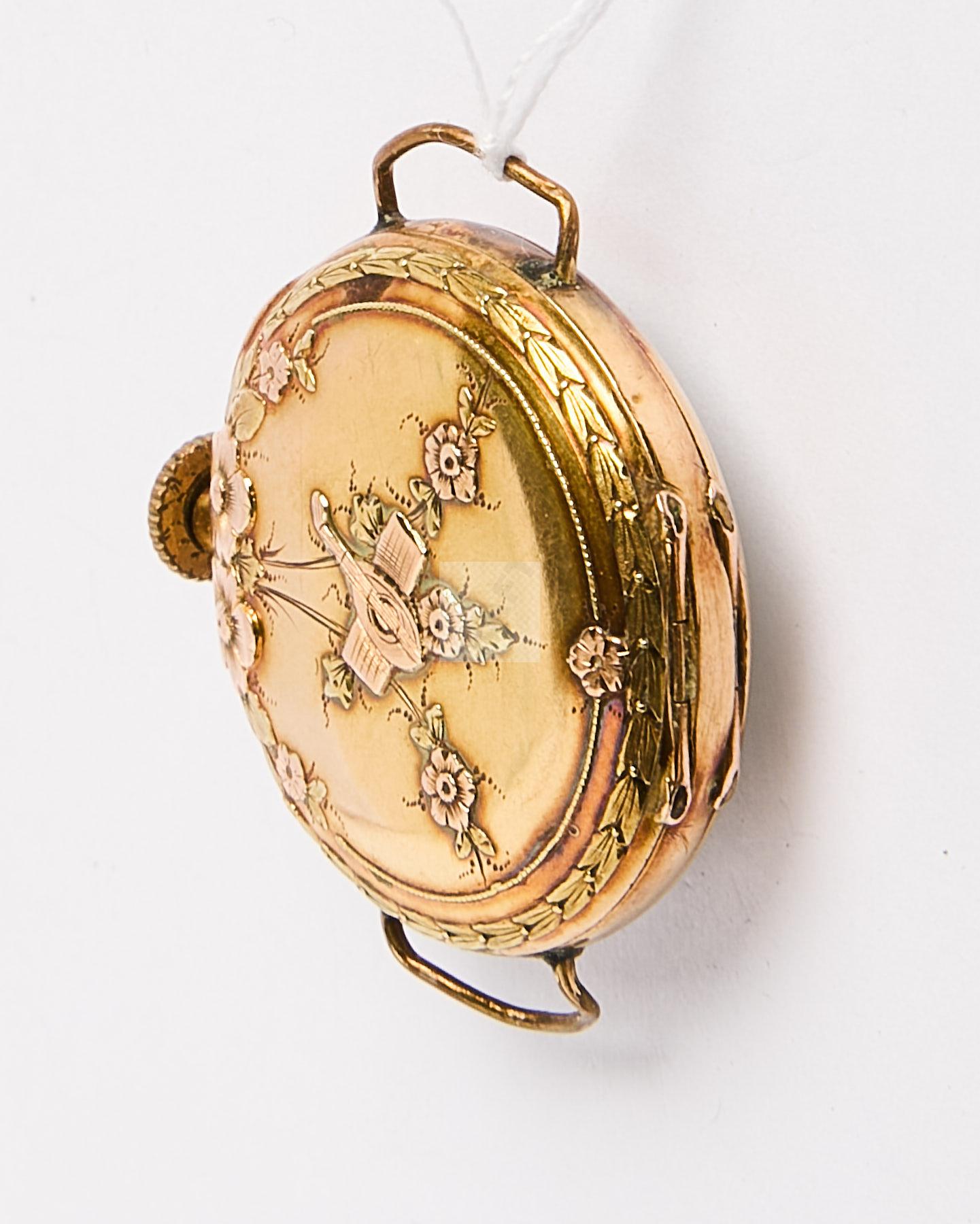 123 Montre de dame en or jaune , double boitier or, le dos gravé d’un trophée d’instruments de musique en 3 ors, mouvement mécanique, sans bracelet, poids brut 16,09 g