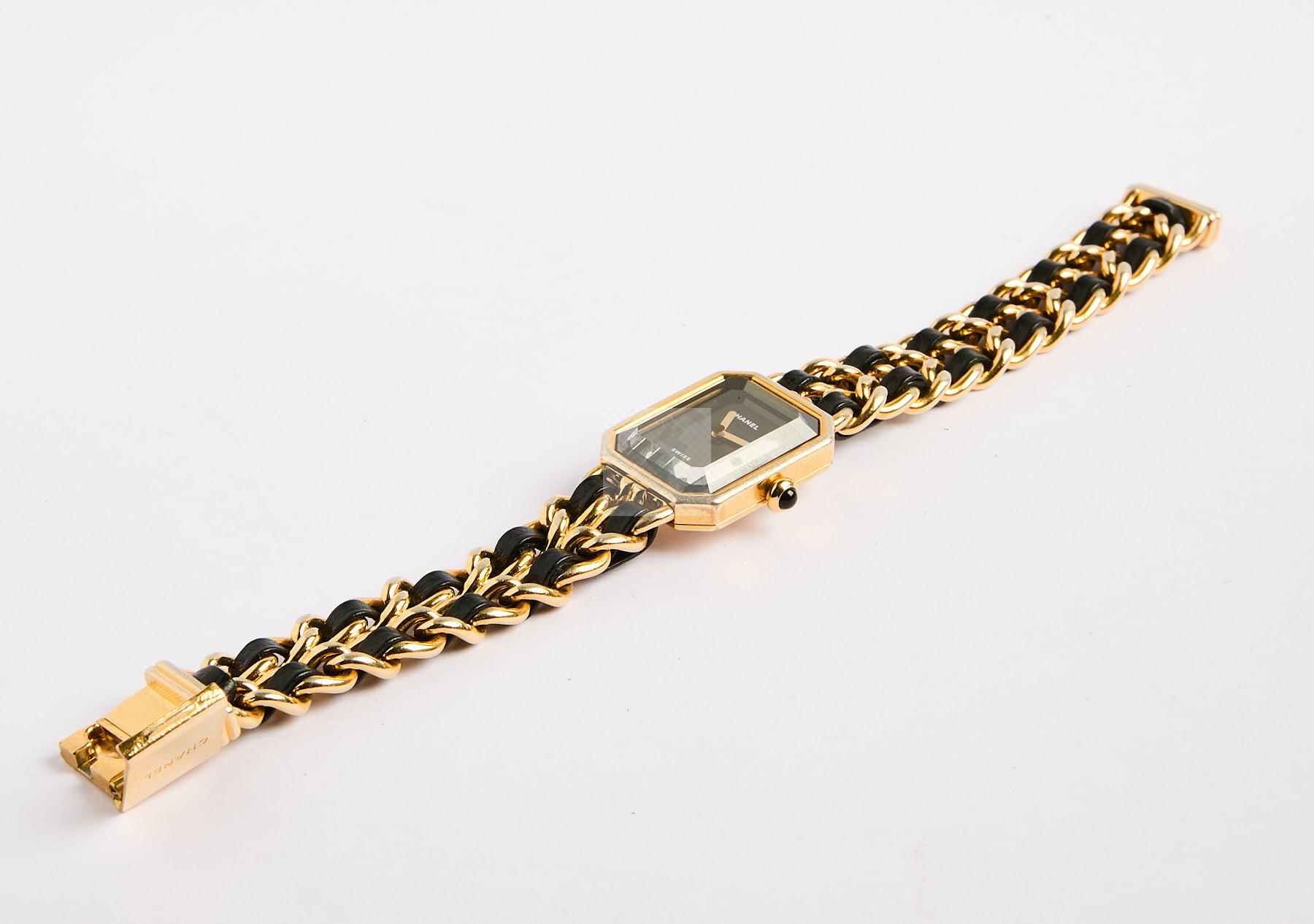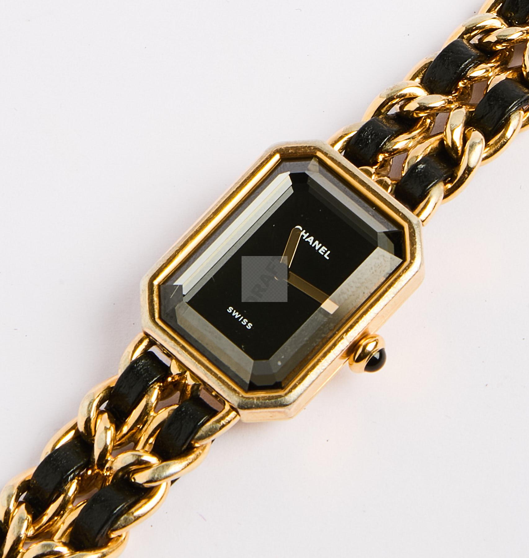 129 CHANEL, modèle « Ma première » Montre bracelet de dame plaquée or, le boitier rectangulaire à pans coupés, le cadran muet à fond noir signé Chanel, aiguilles bâtons dorées, la couronne sertie d’un cabochon noir, le bracelet en maillon plaqué or et passants cuir noir tressé terminé par un fermoir signé. Mouvement quartz. Signée et numérotée