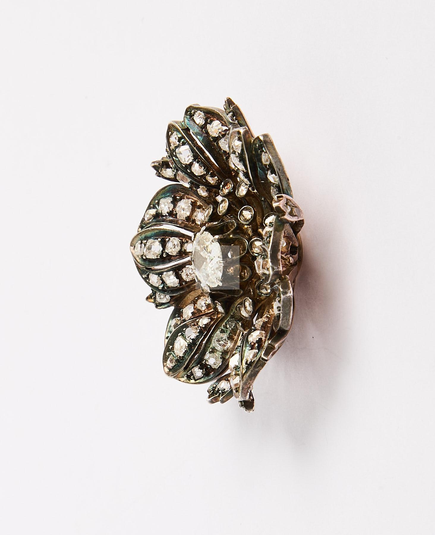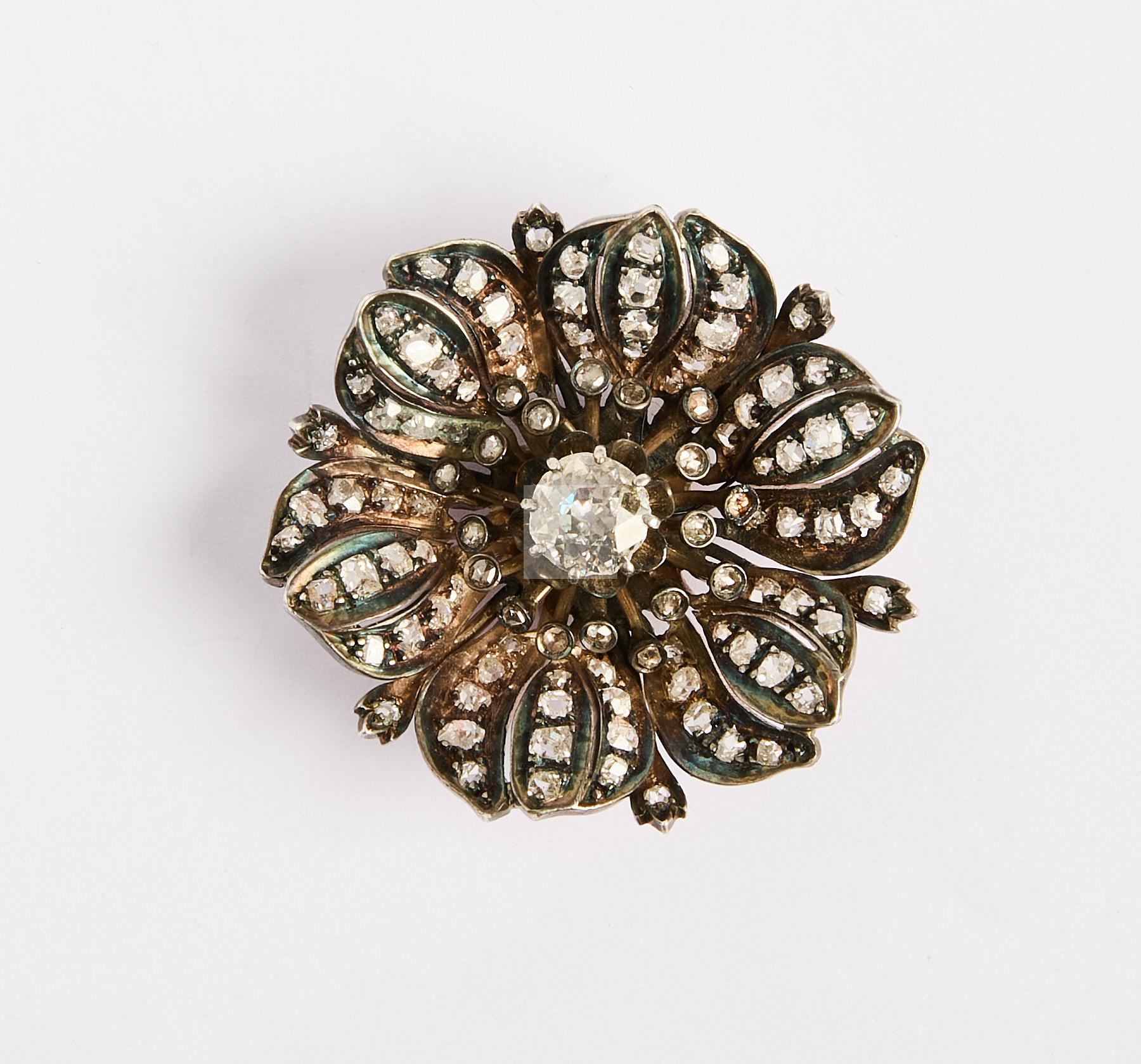 Lot n°151 - 151 Broche fleur en argent doublé or pavée de diamants tailles anciennes et tail