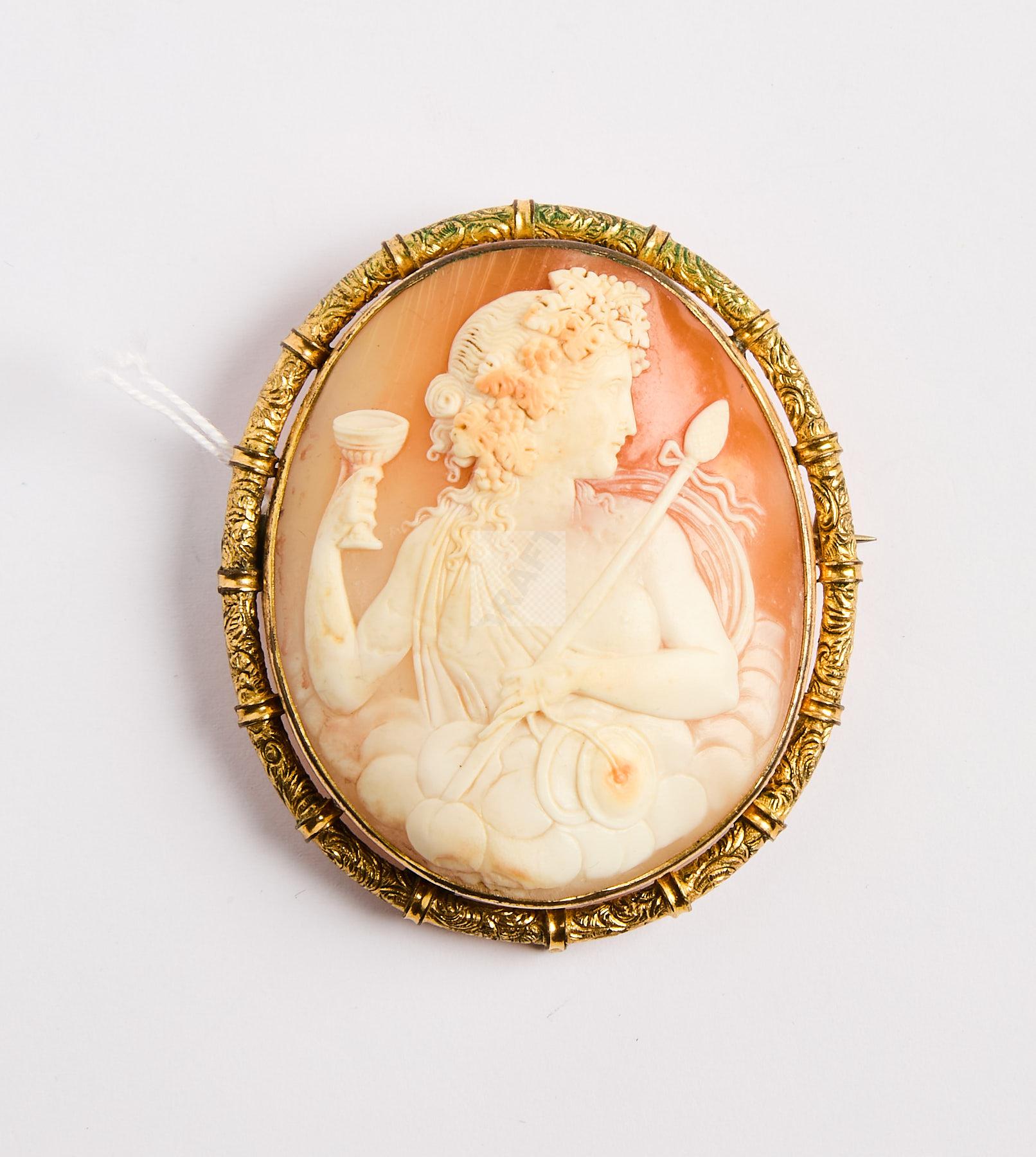 Lot n°156 - 156 Grande broche en pomponne ornée d’un grand camée coquille représentant une d