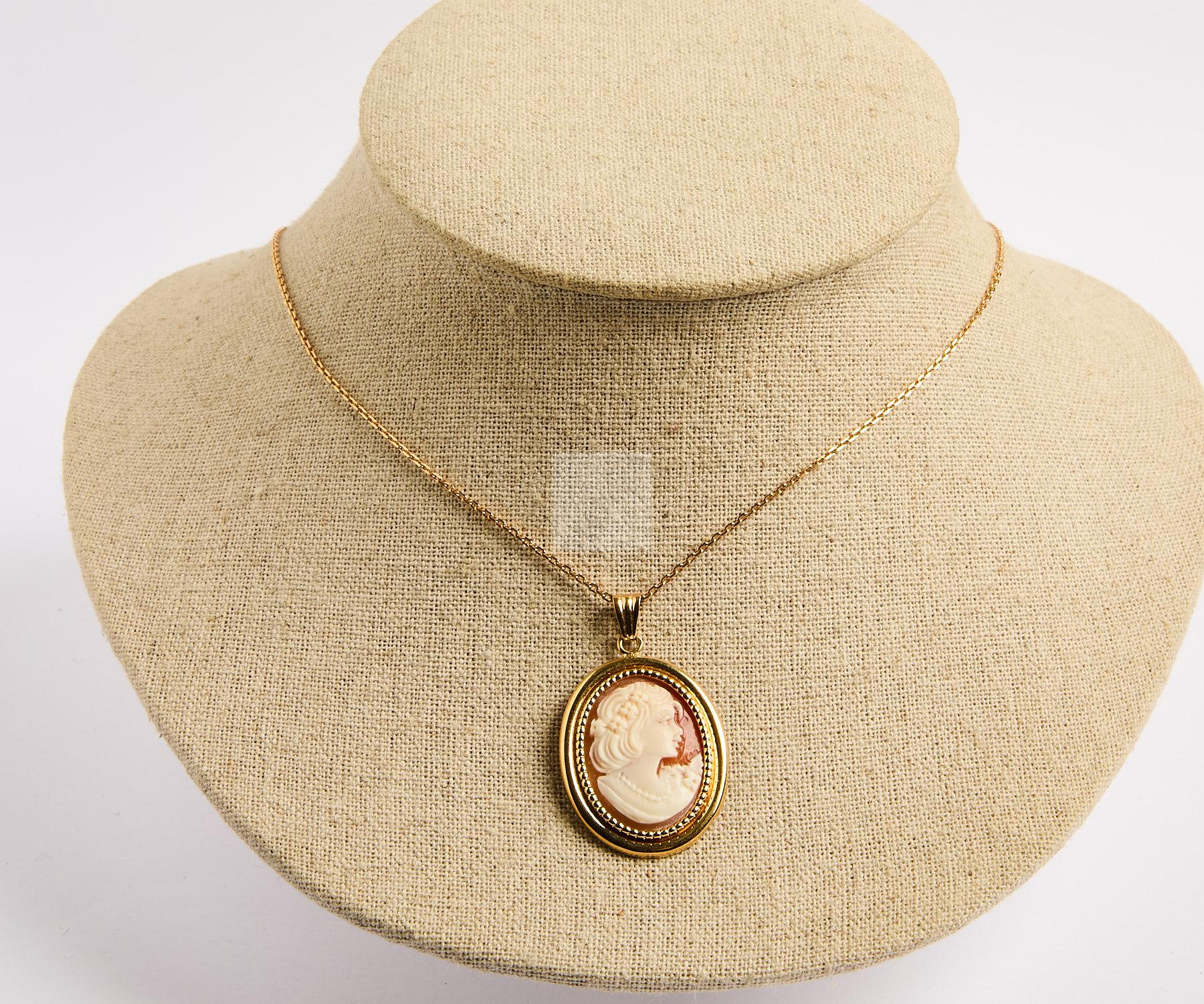 Lot n°158 - 158 Chaine de cou en or jaune 750 ‰, 58 cm, ornée d’un camée coquille de 2 cm à