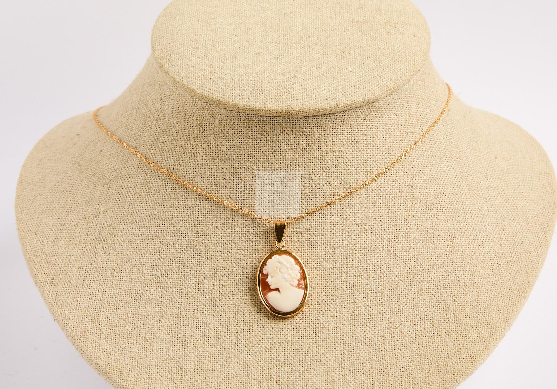 162 Paire de clous d’oreilles en or jaune 750 ‰ sertis de diamants de 0,15 ct environ (manque une poucette) poids 0,5 g on joint une chaine de cou en or jaune 750 ‰ et son pendentif or et camée coquille, poids brut 3 g