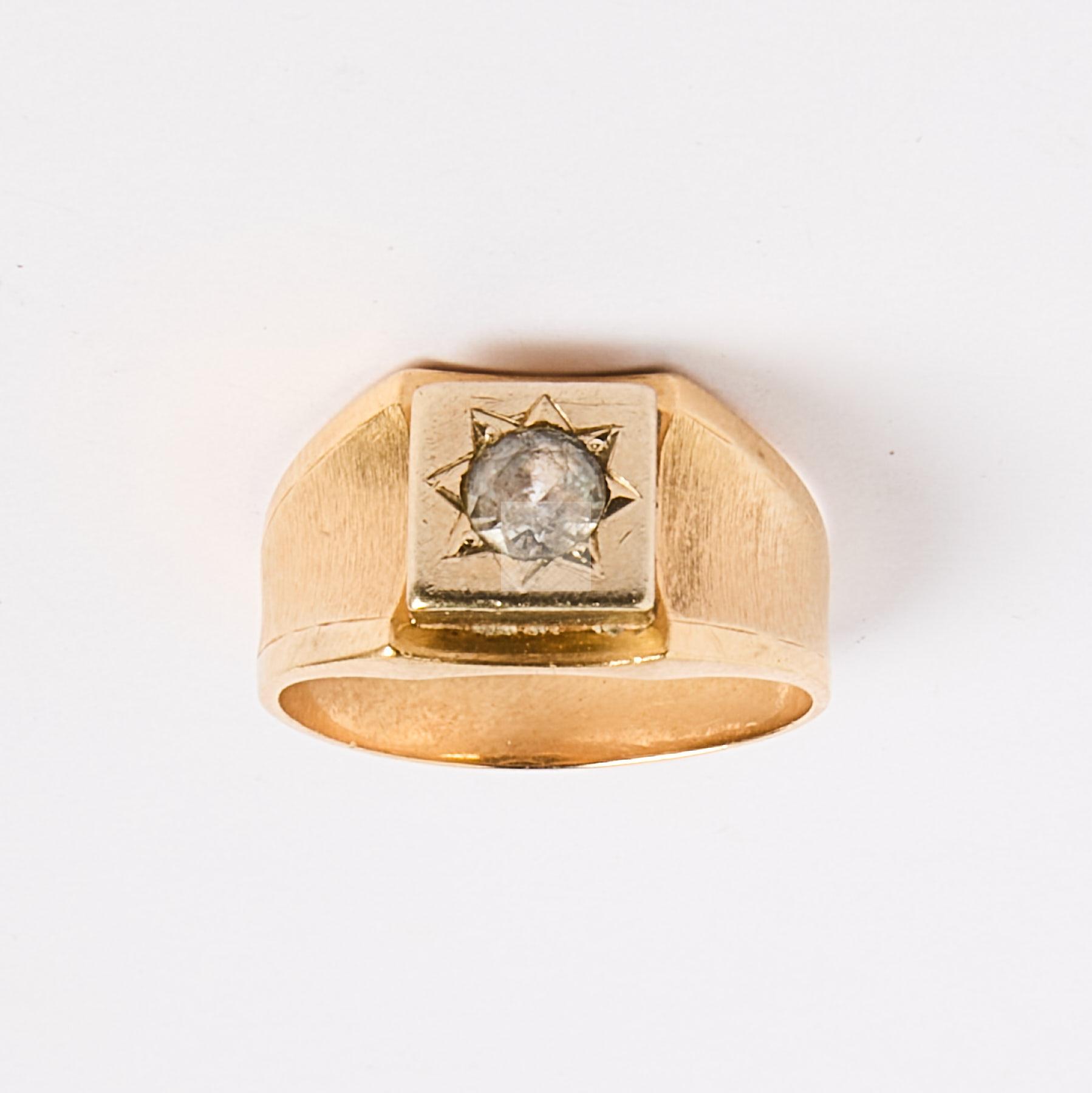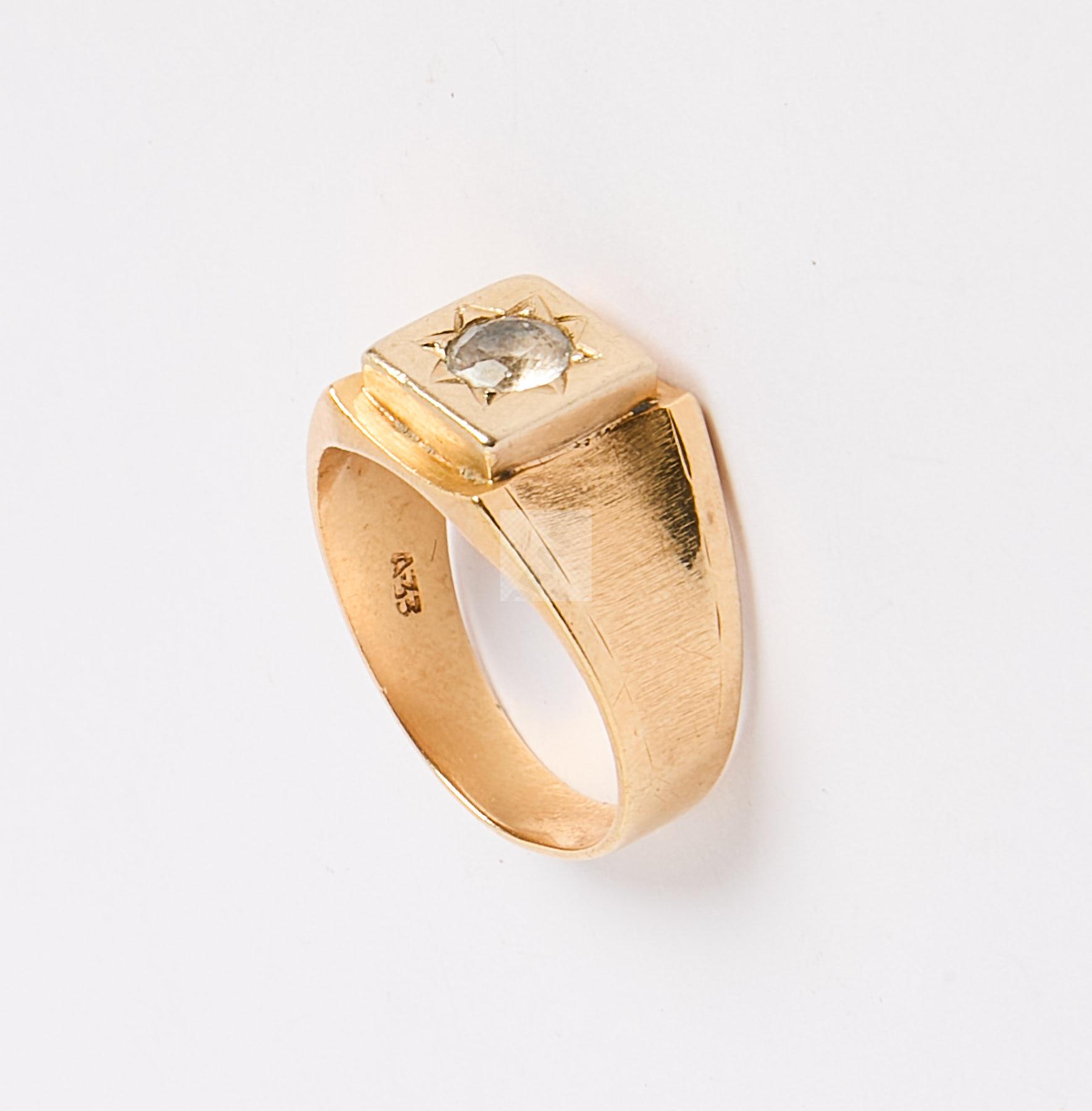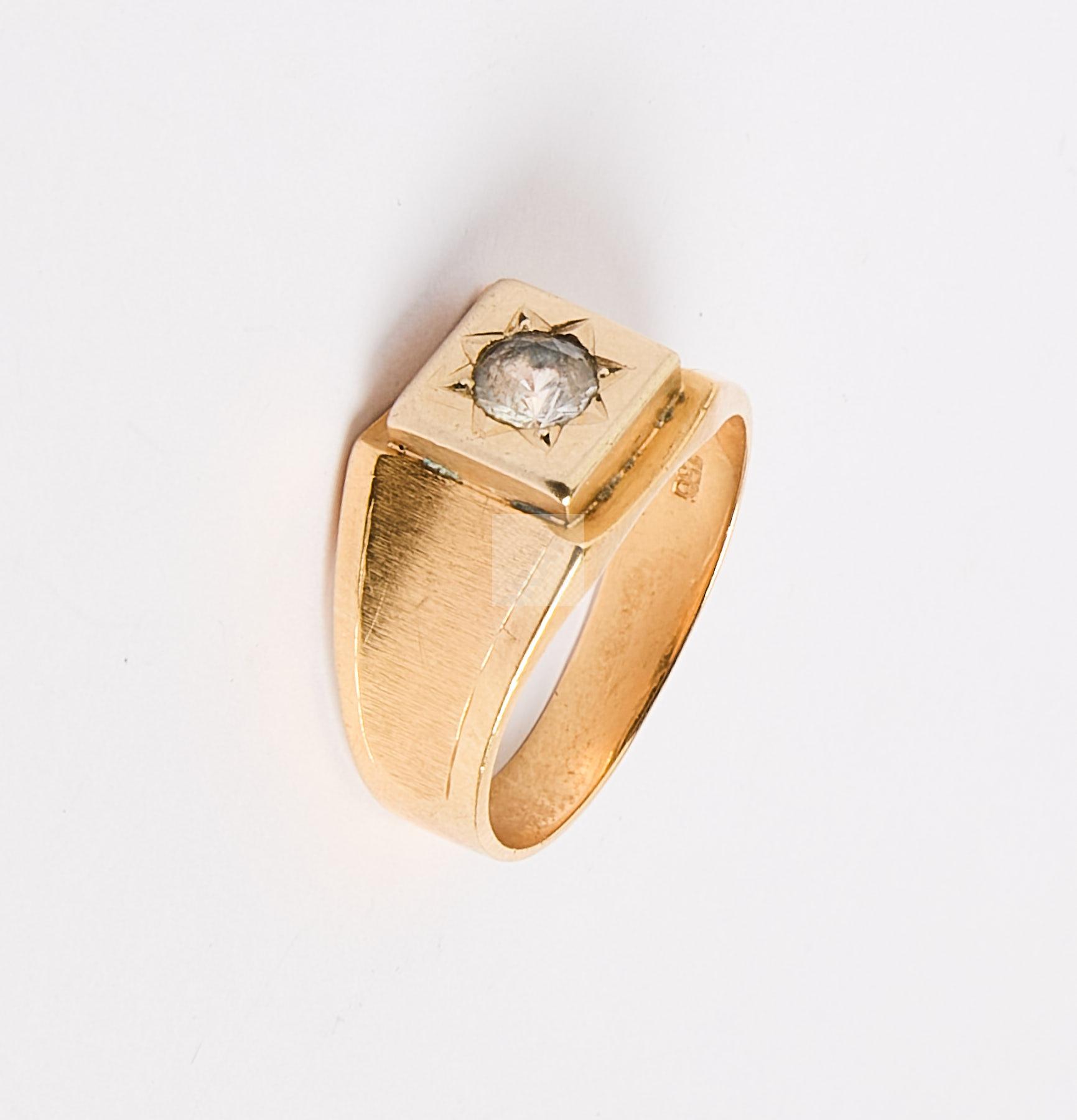 Lot n°163 - 163 Chevalière en or jaune 750/1000 sertie d’une pierre blanche,