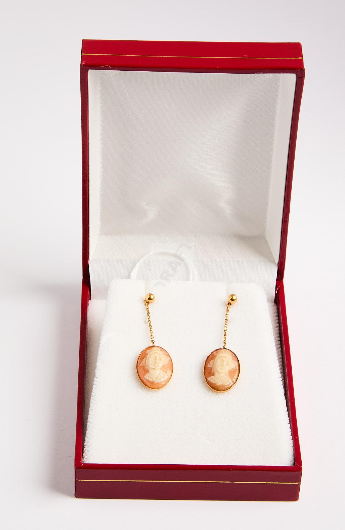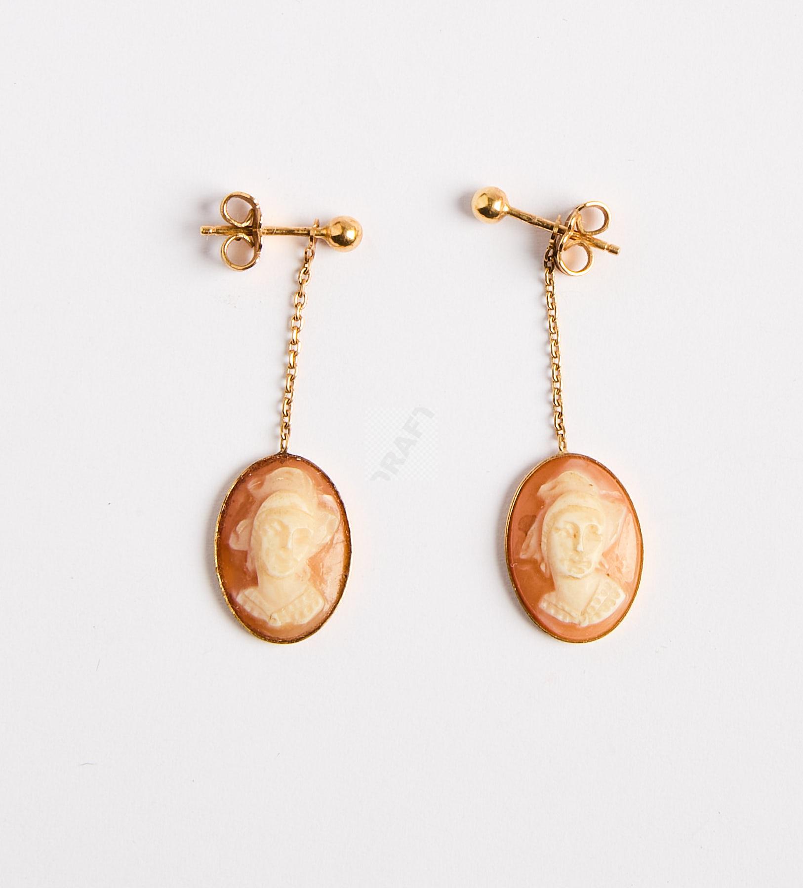 180 Paire de pendants d’oreilles en or jaune 750 ‰ et camées coquilles gravés de jeunes femmes, poids 2 g