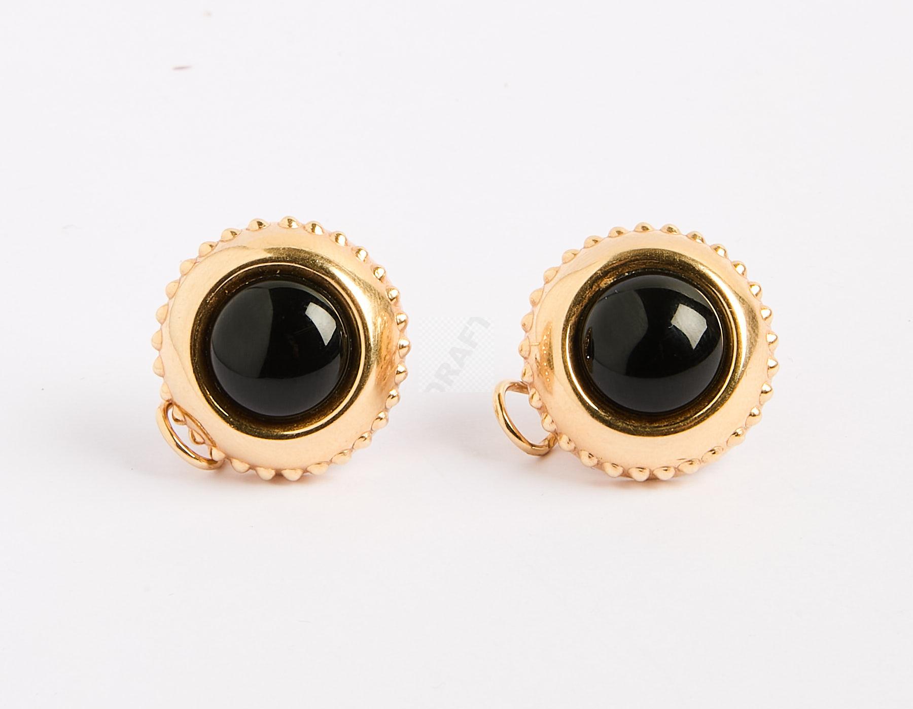 182 Paire de boucles d’oreilles en or jaune 585 ‰ pour oreilles percées et cabochons de verre noir, poids brut 8,7 g