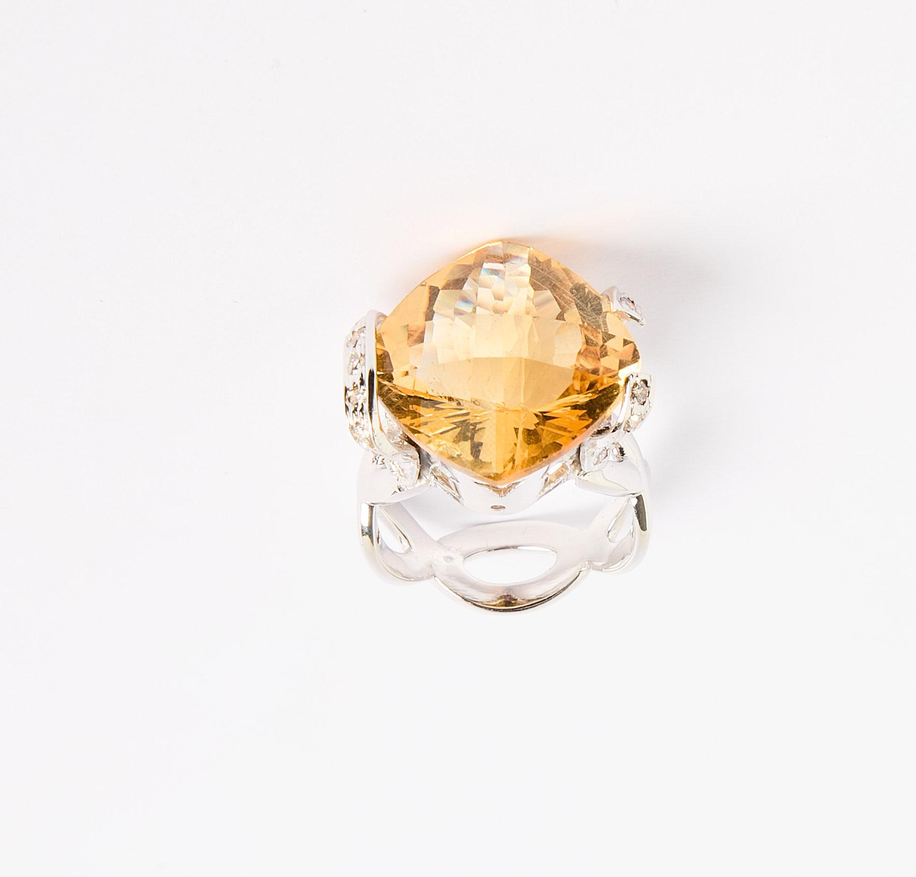 193 Bague en or gris 750 ‰ sertie d’une grande citrine coussin taille brésilienne entre une boucle et deux brins sertis de diamants, tour de doigt 54, poids brut 11,5 g,
