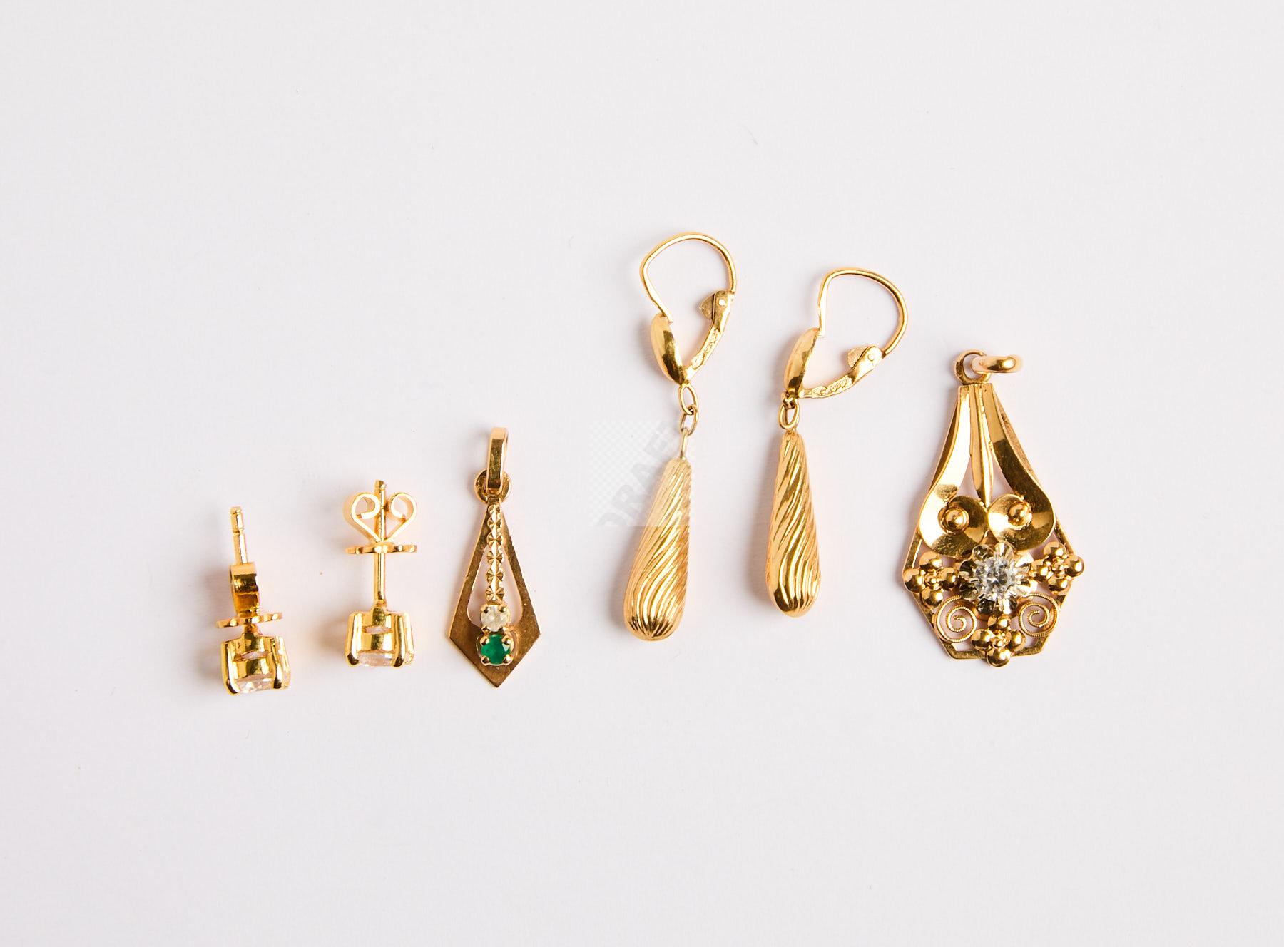 210 Paire de pendants d’oreilles en or jaune 750 ‰, on joint une paire de clous d’oreilles en or jaune 750 et pierres blanches et deux pendentifs or jaune 750 ‰, poids 6,4 g