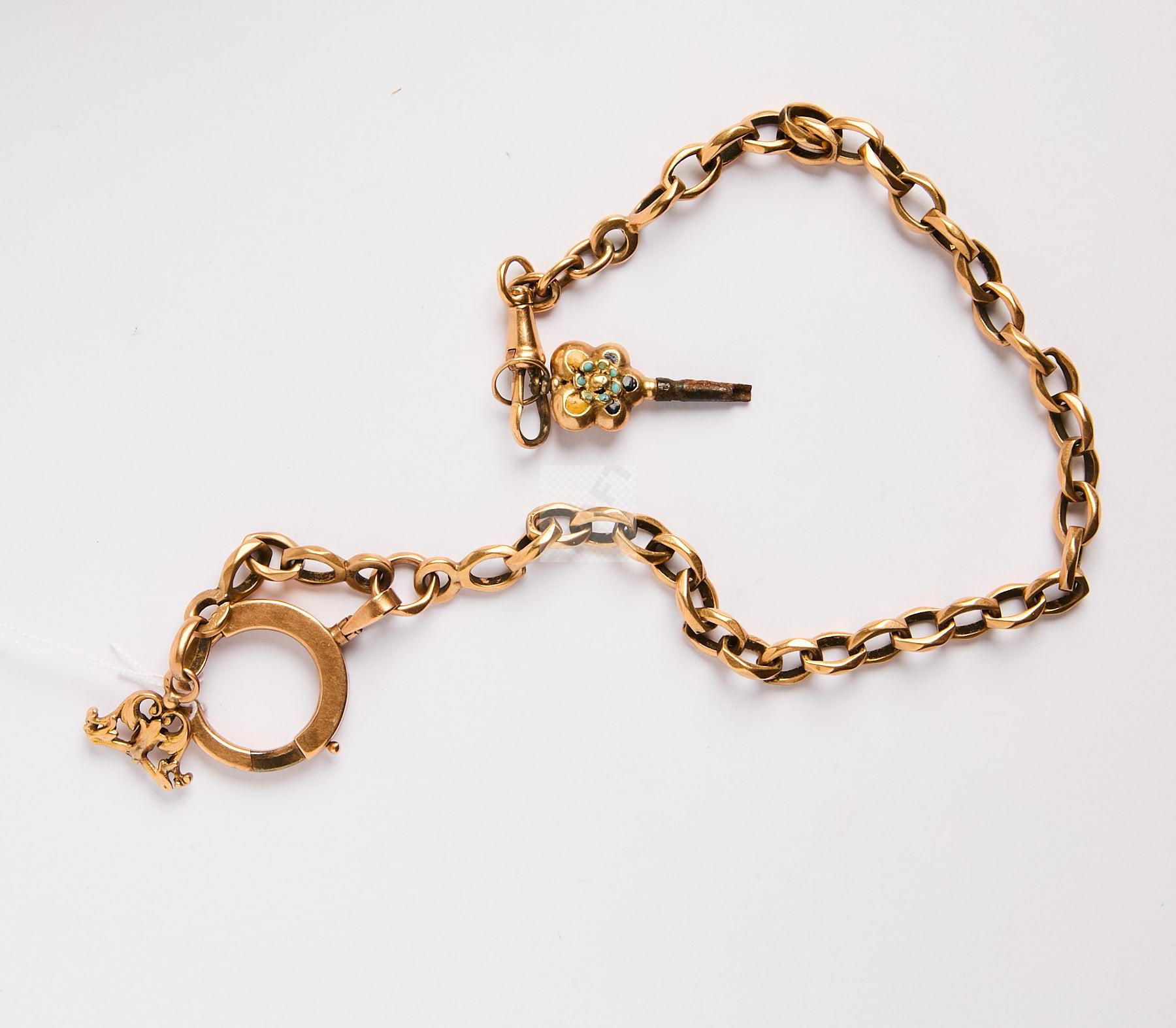 253 Chaine de montre en or jaune 750 ‰, poids brut 26,55 g on joint une petite clé or émaillé et acier accidentée, poids brut1,16 g