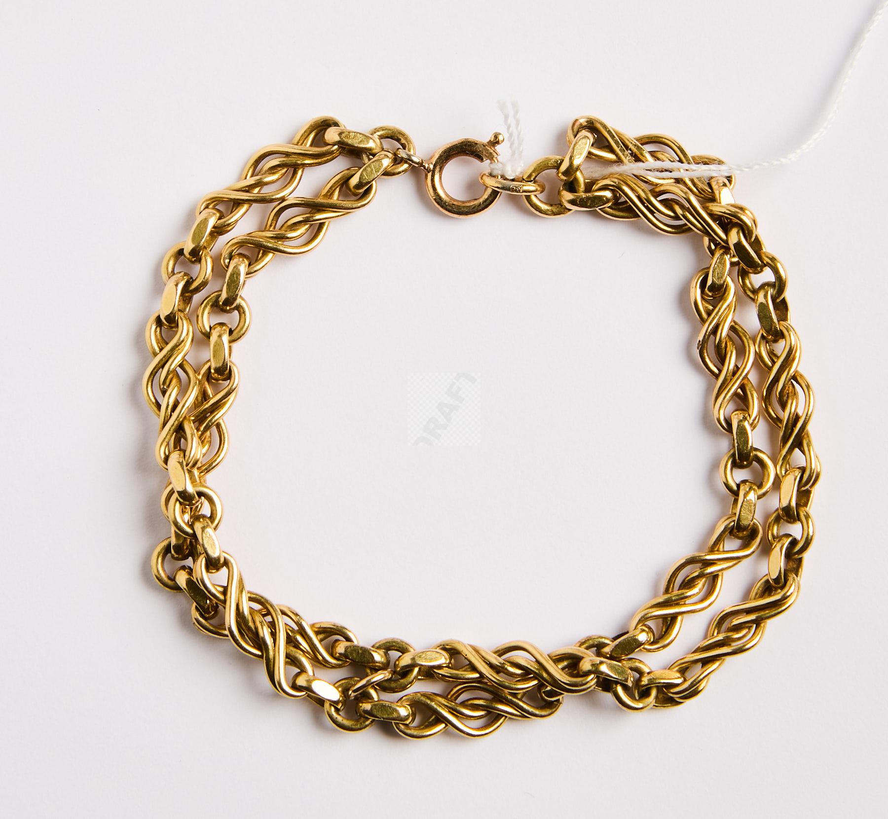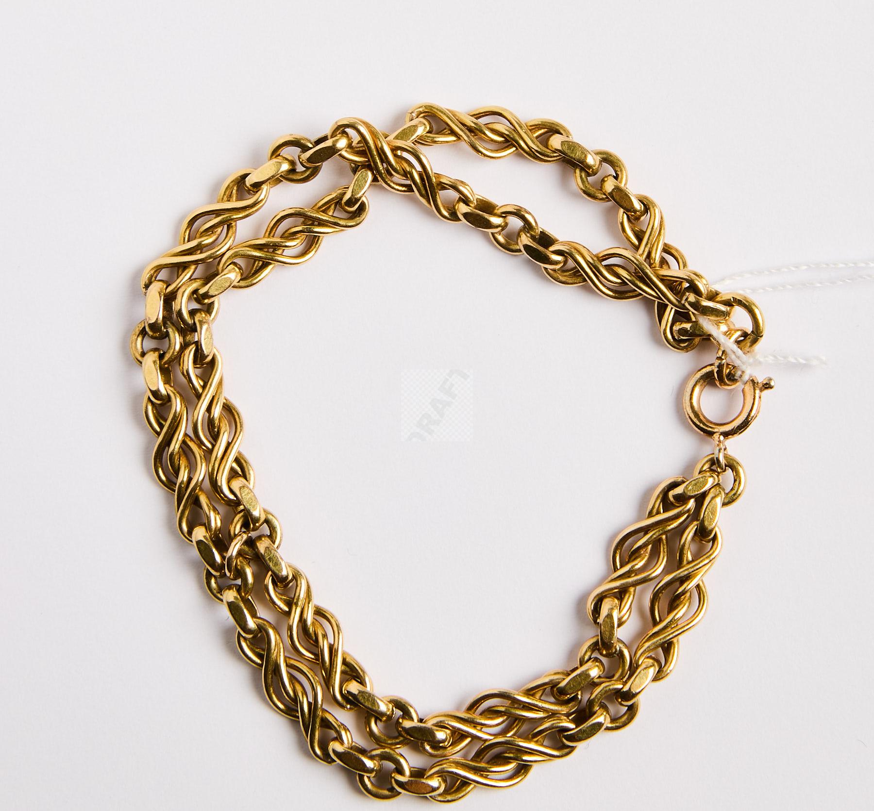 255 Partie de chaine giletière en or jaune 750 ‰ double ligne de torsades, remontée en bracelet , 16,5 cm, poids 11,36 cm